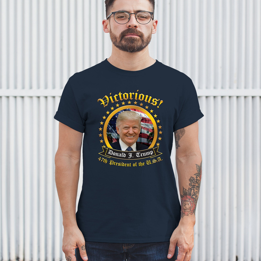 Showcase your support for Trump as the 47th President with this "Victorious" design. Perfect for patriots, America First advocates, and Red Wave supporters.