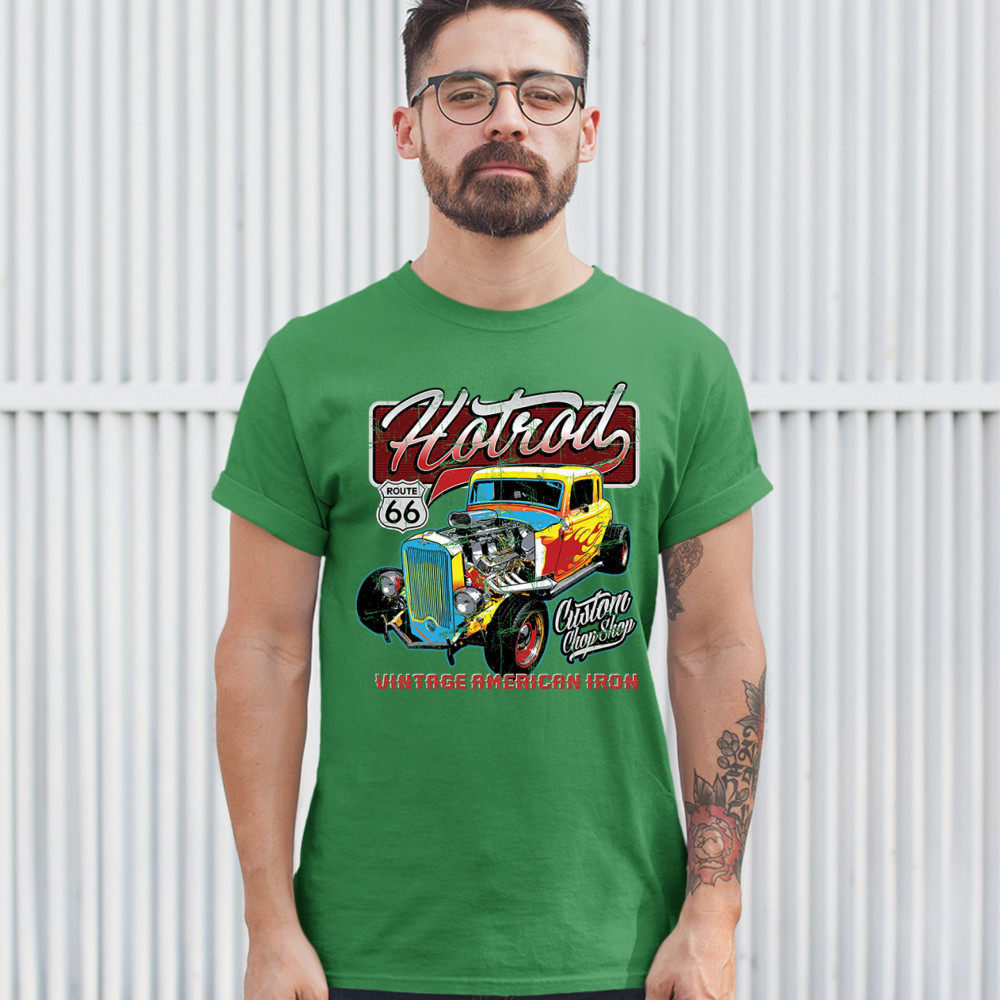 A print featuring a hot rod and a "Route 66" sign. The print says "Hot rod. Custom chop shop. Vintage American iron". A great choice for Route 66 and hot rod fans.