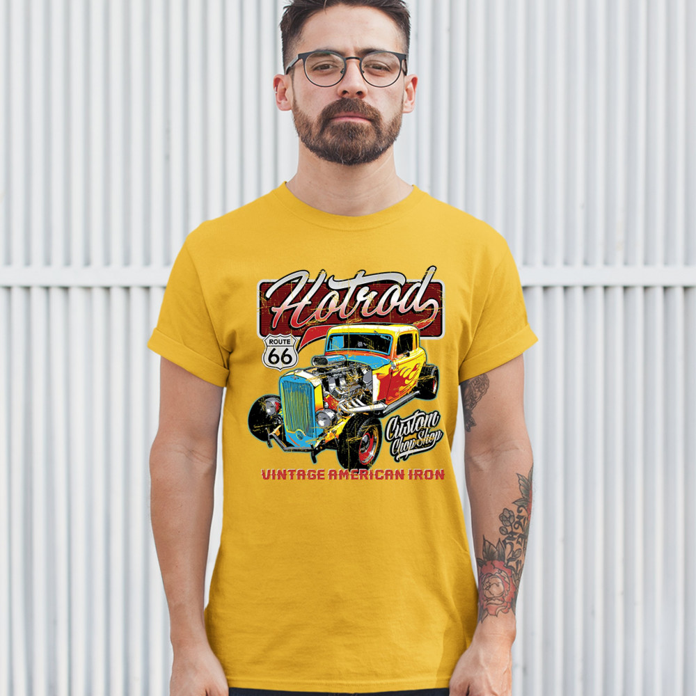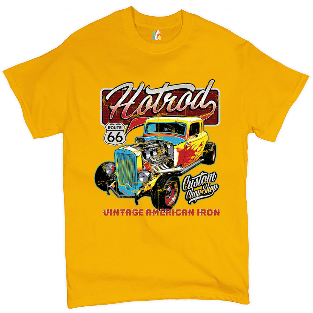 VINTAGE AMERICAN IRON t-shirt hot rod route 66 retro racing men's tee yellow