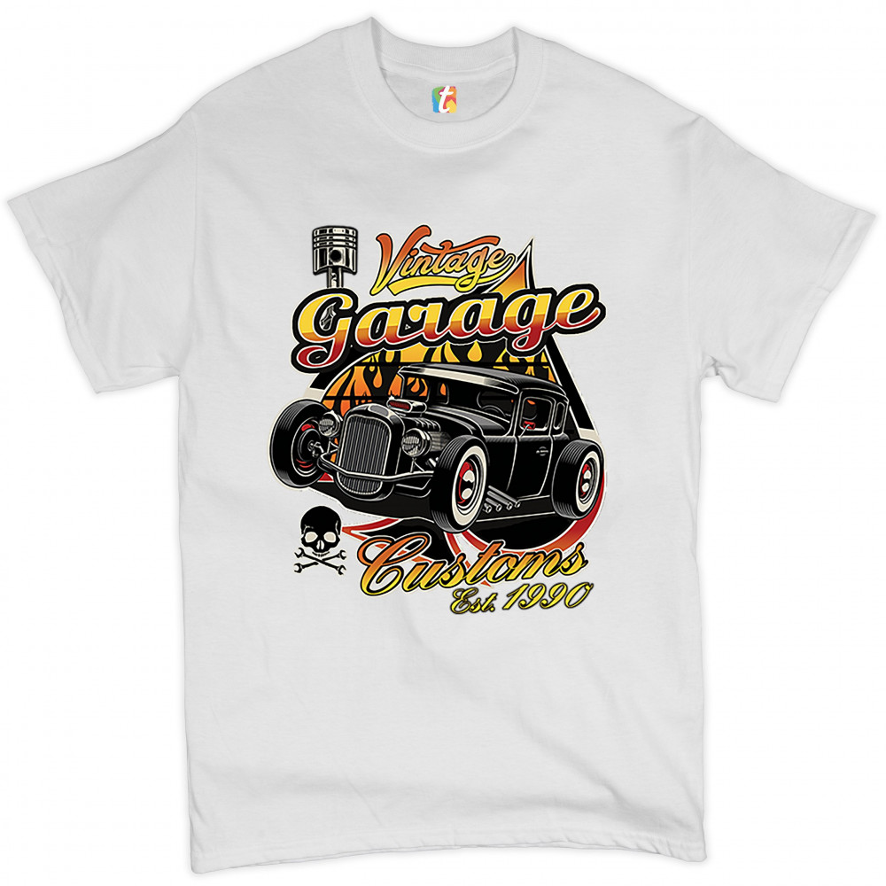 A print featuring a lowrider hot rod, a small skull with crossed wrenches instead of bones, a piston and an ace of spades in the background. The orint says: "Vintage Garage Customs Est. 1990". A great choice for a fan of customized American classic cars a