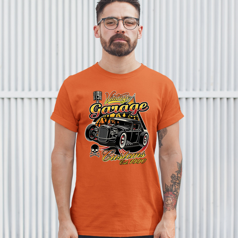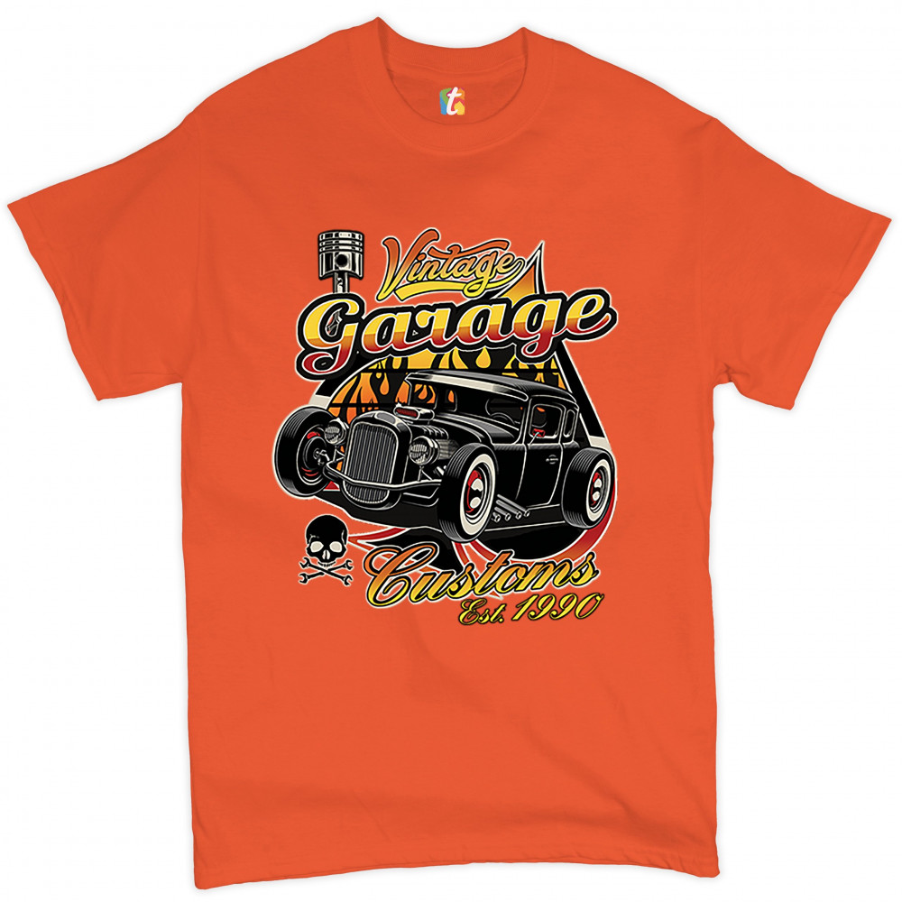 A print featuring a lowrider hot rod, a small skull with crossed wrenches instead of bones, a piston and an ace of spades in the background. The orint says: "Vintage Garage Customs Est. 1990". A great choice for a fan of customized American classic cars a