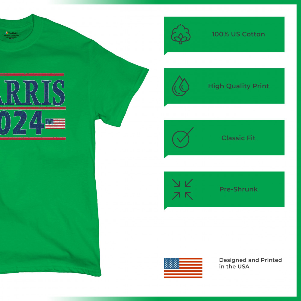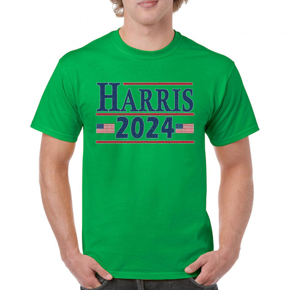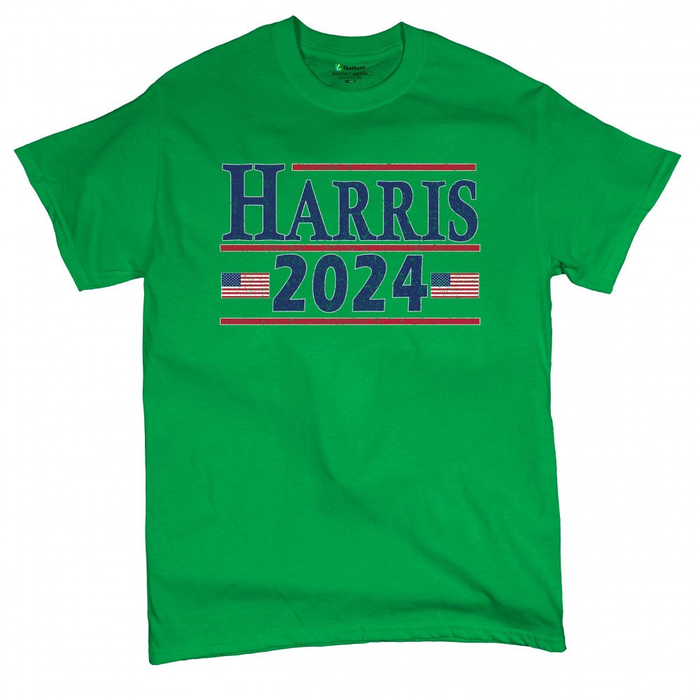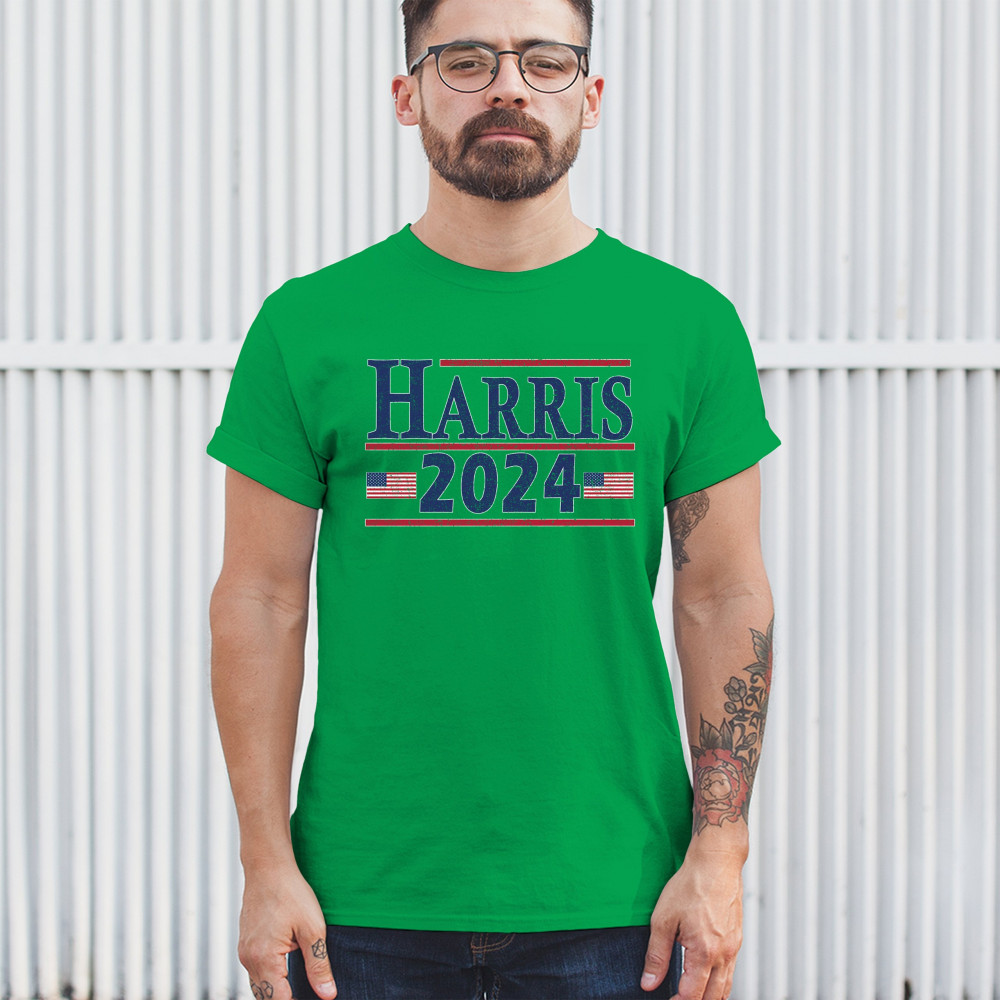 Show your support for Kamala Harris with this bold "Harris 2024" t-shirt, featuring American flags. Perfect for rallies and events. Join the movement today!
