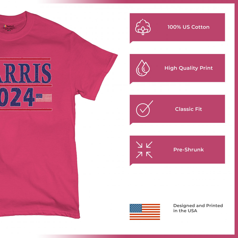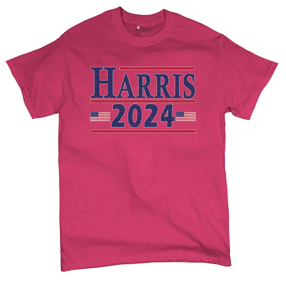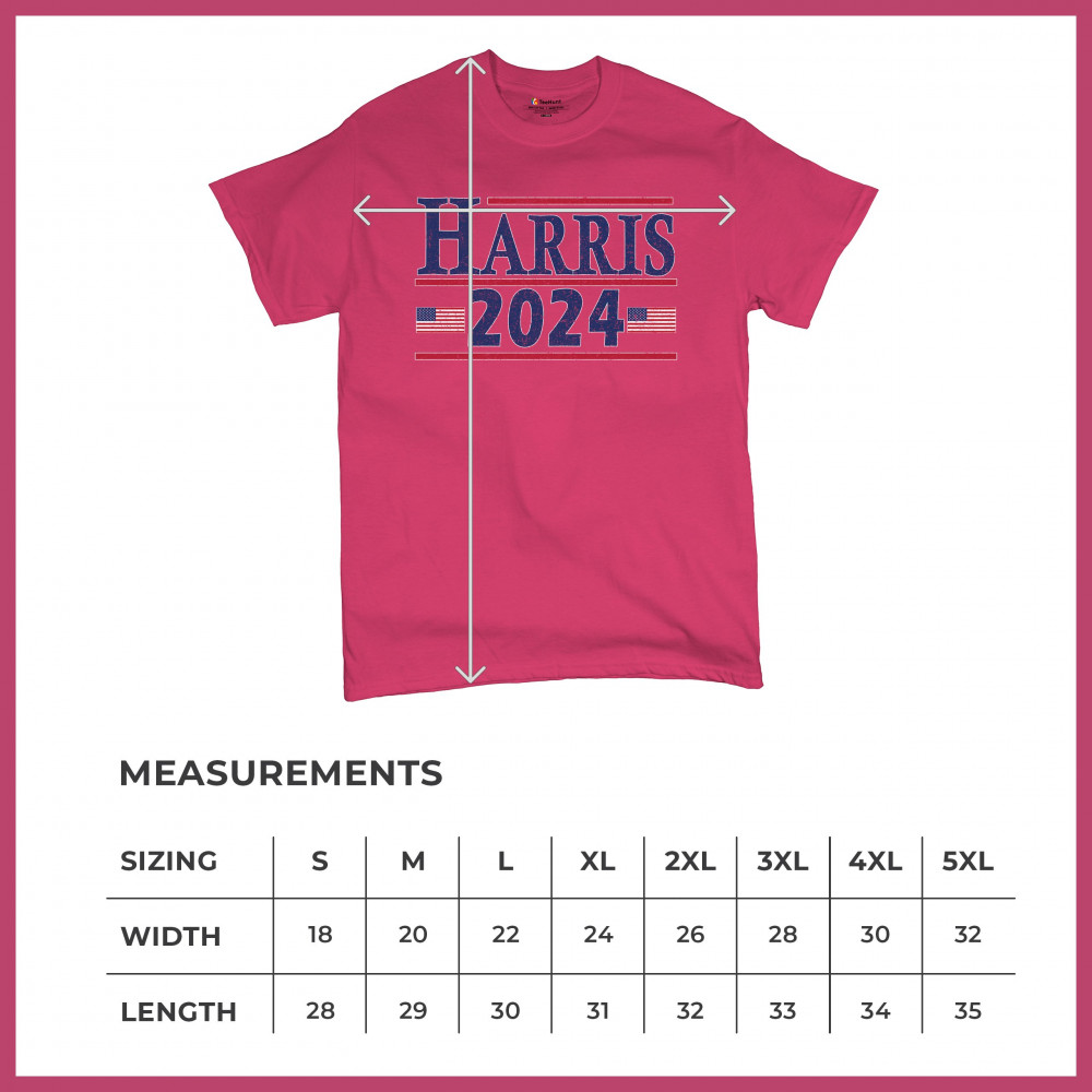 Show your support for Kamala Harris with this bold "Harris 2024" t-shirt, featuring American flags. Perfect for rallies and events. Join the movement today!