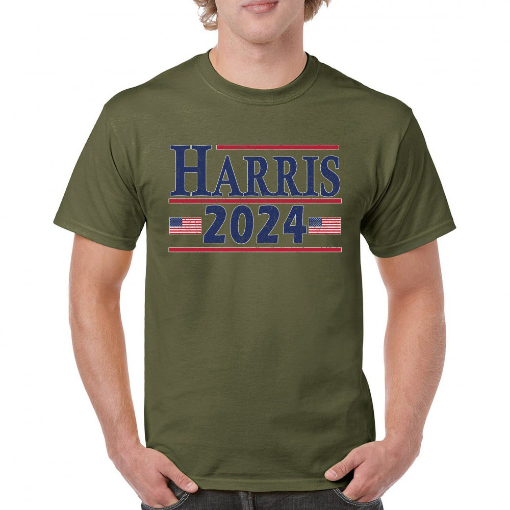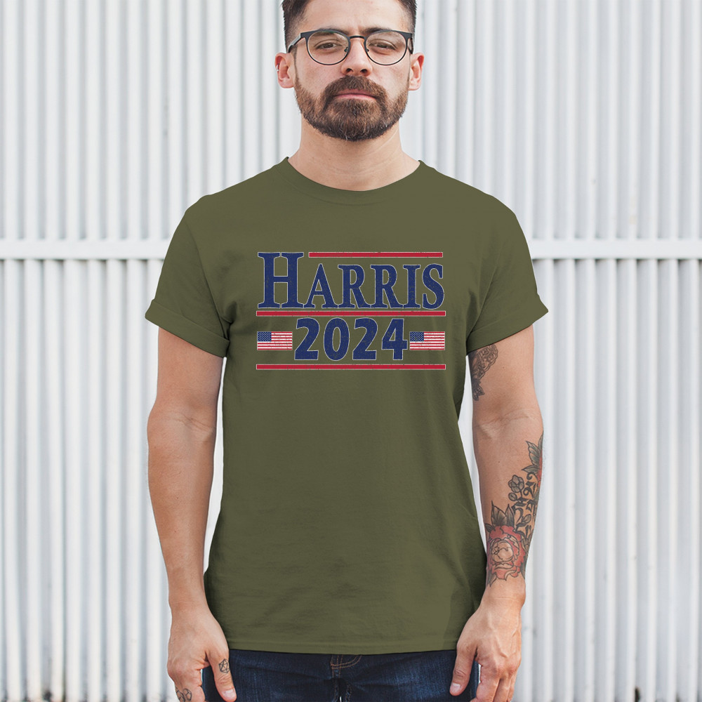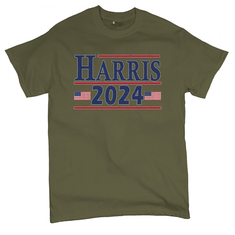 Show your support for Kamala Harris with this bold "Harris 2024" t-shirt, featuring American flags. Perfect for rallies and events. Join the movement today!