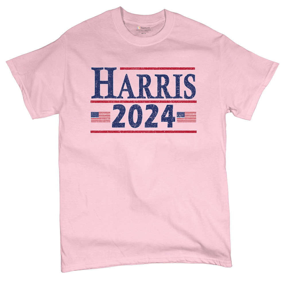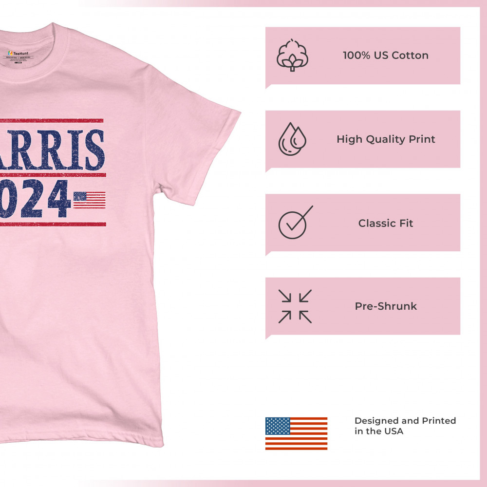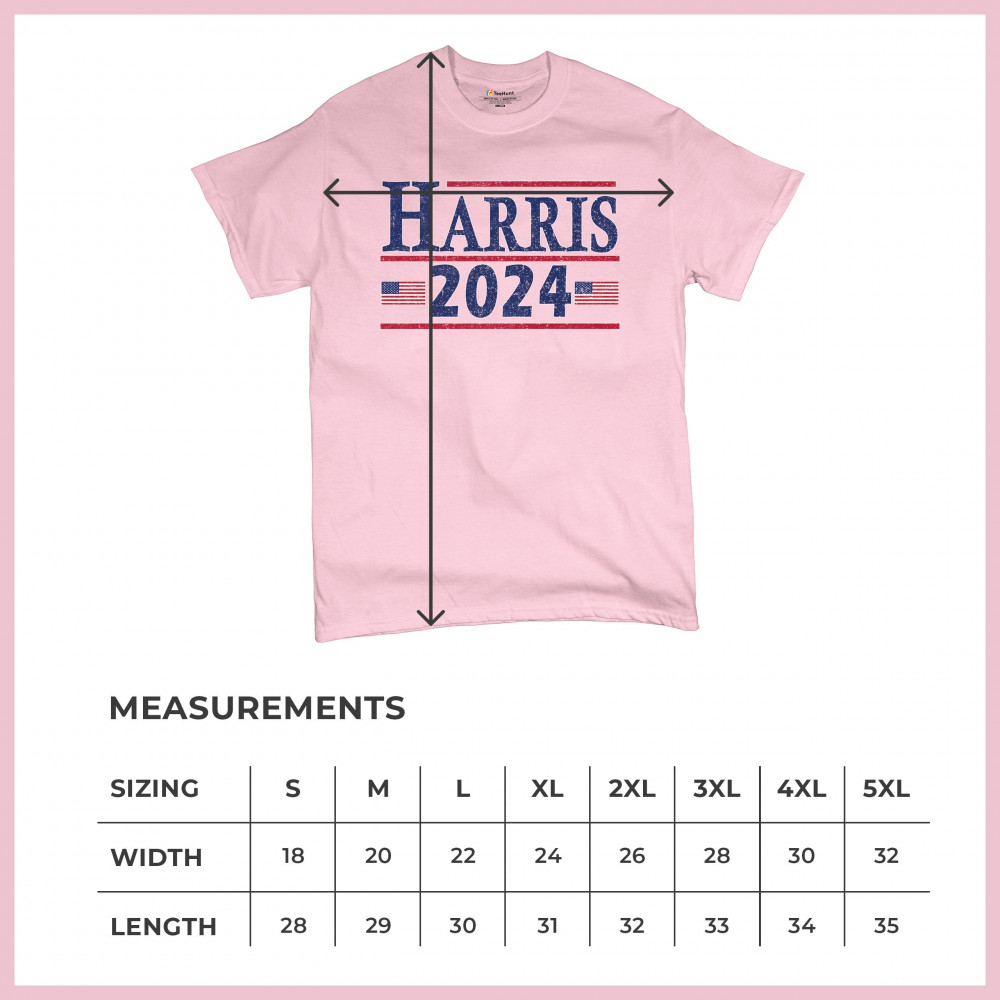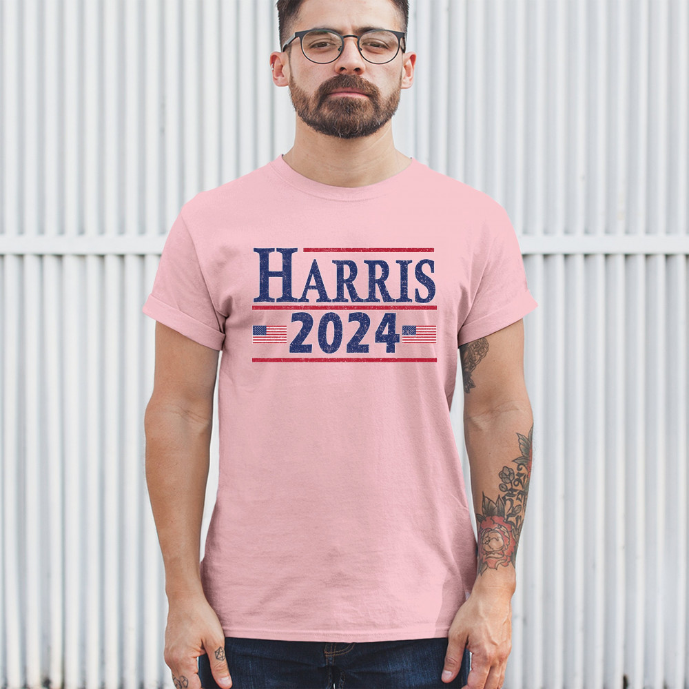 Show your support for Kamala Harris with this bold "Harris 2024" t-shirt, featuring American flags. Perfect for rallies and events. Join the movement today!