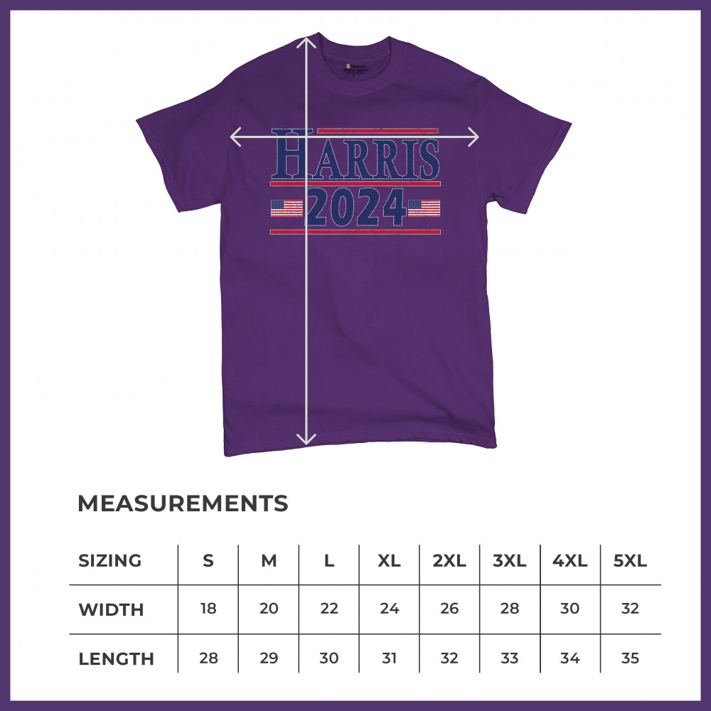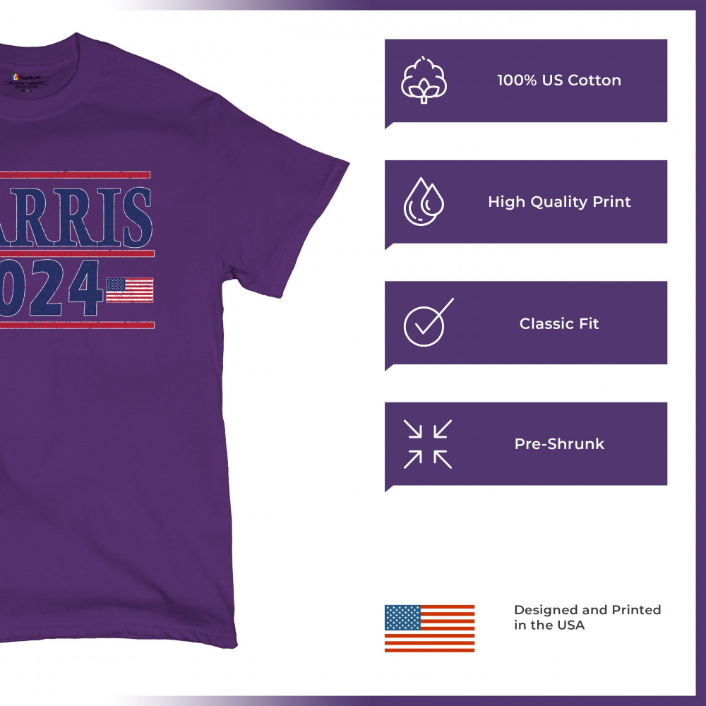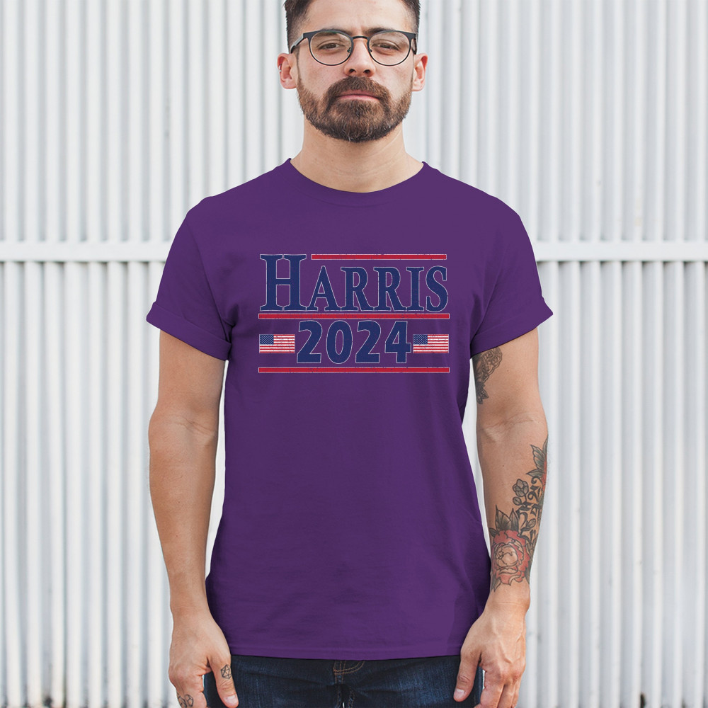 Show your support for Kamala Harris with this bold "Harris 2024" t-shirt, featuring American flags. Perfect for rallies and events. Join the movement today!