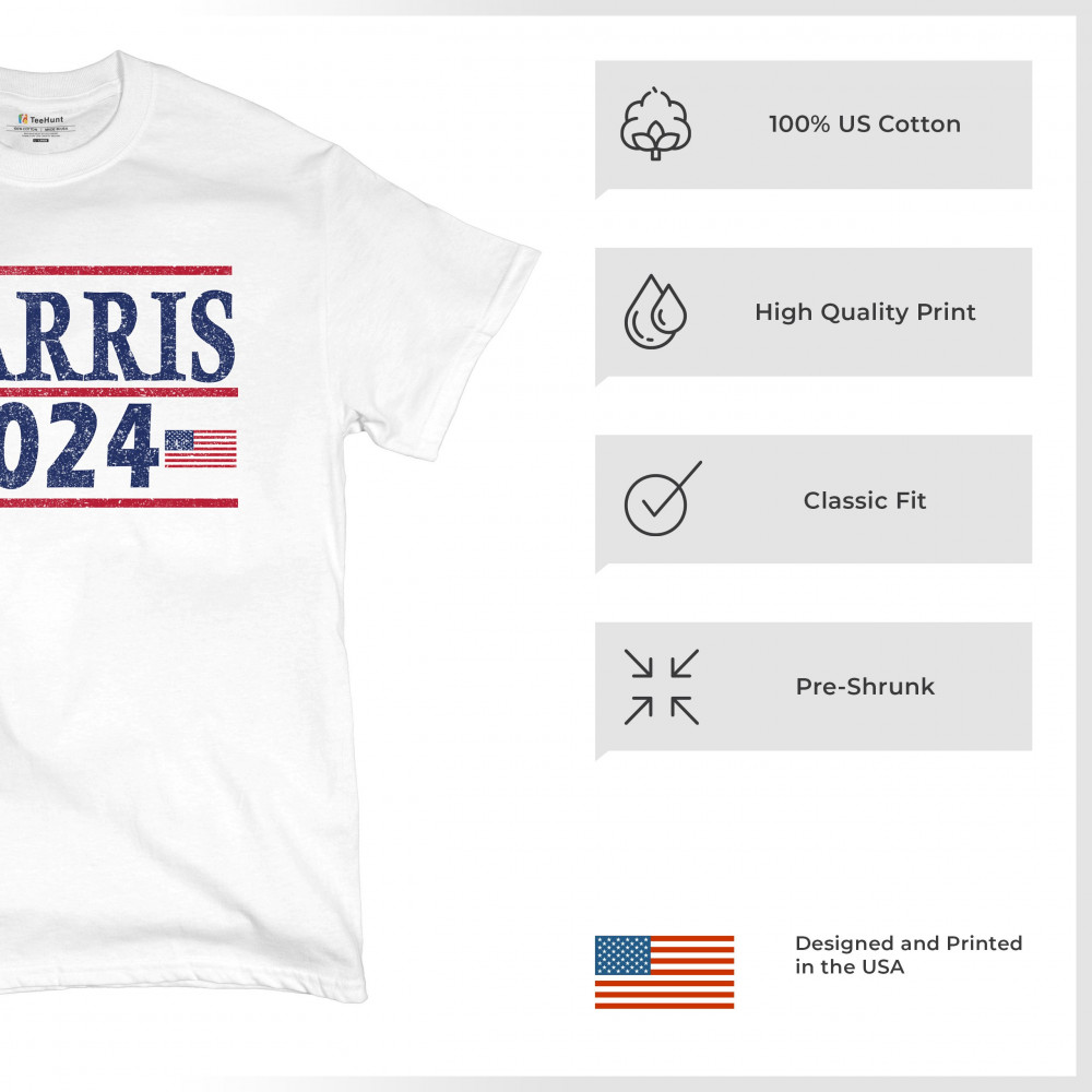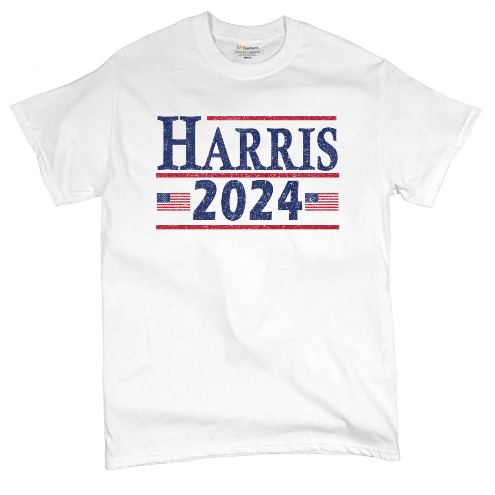 Show your support for Kamala Harris with this bold "Harris 2024" t-shirt, featuring American flags. Perfect for rallies and events. Join the movement today!