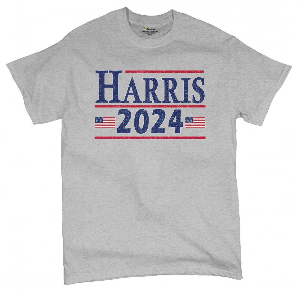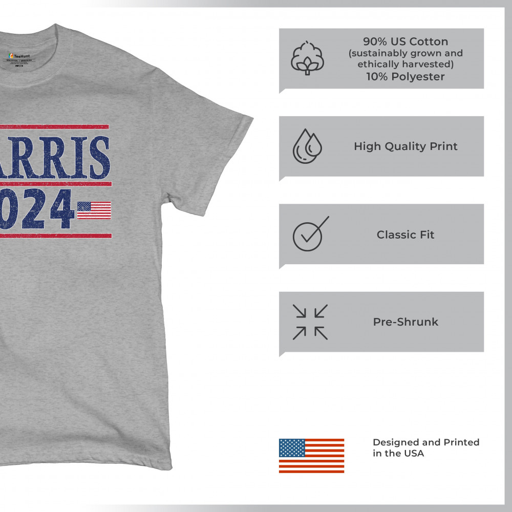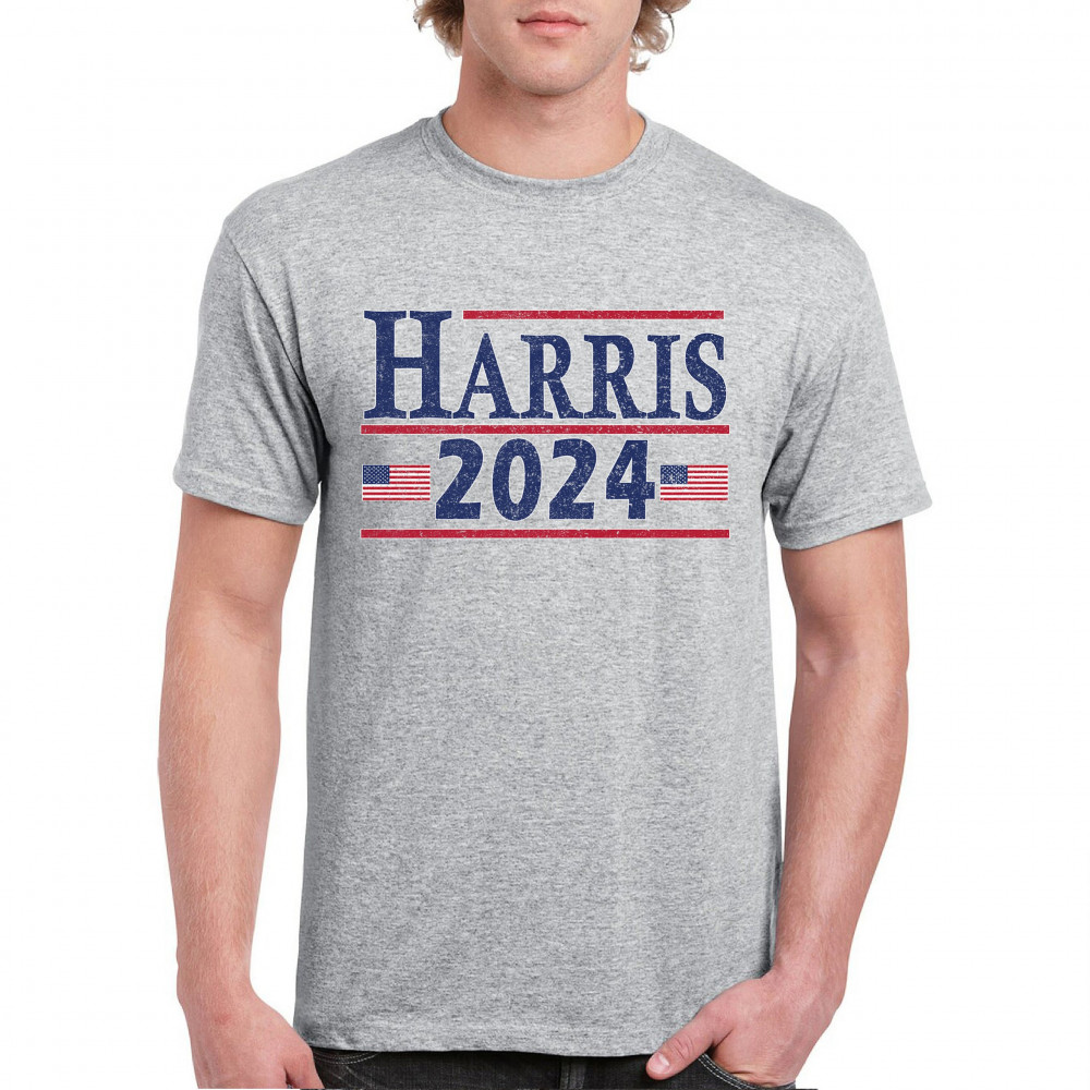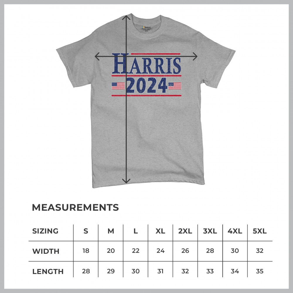 Show your support for Kamala Harris with this bold "Harris 2024" t-shirt, featuring American flags. Perfect for rallies and events. Join the movement today!