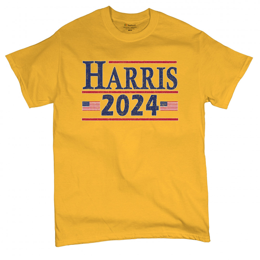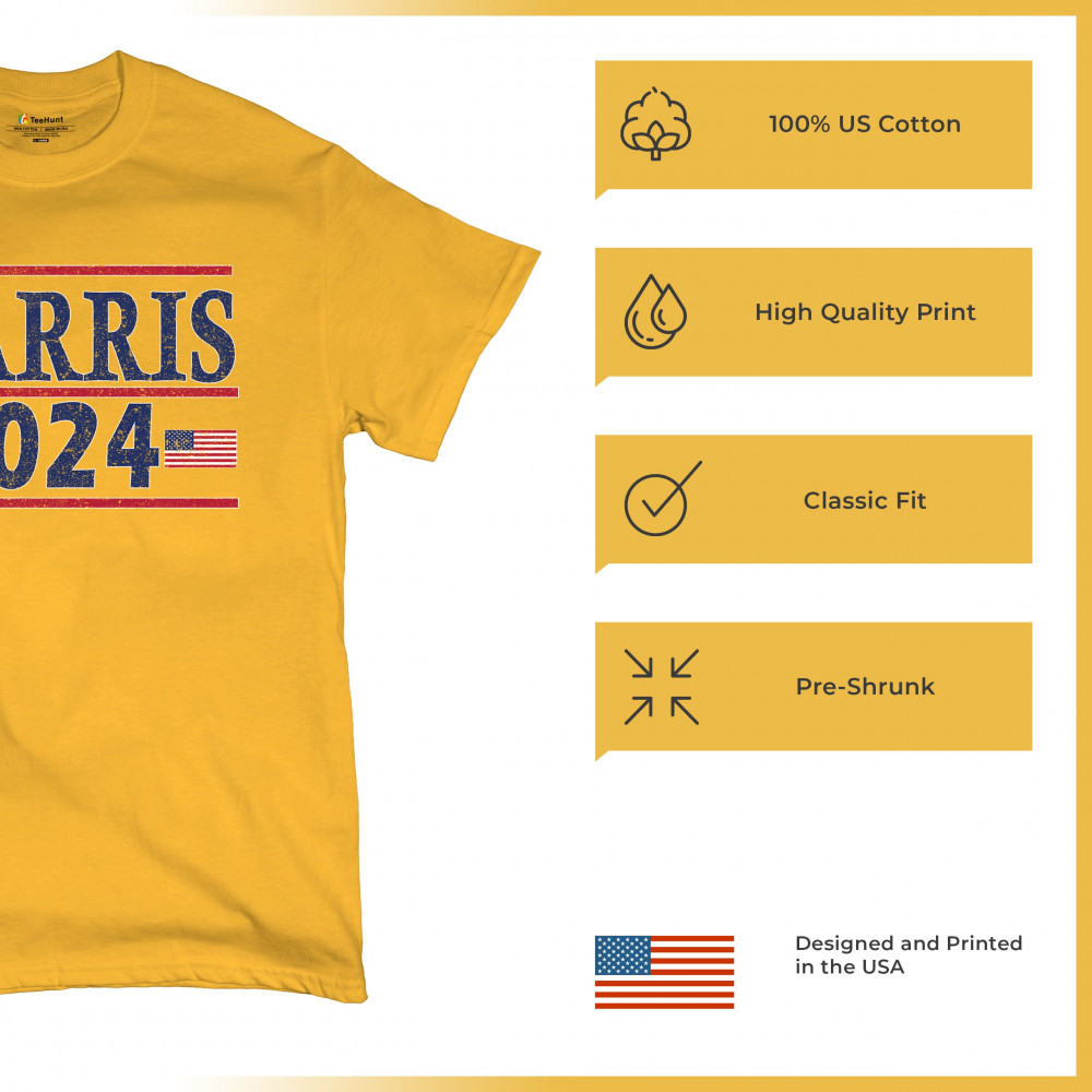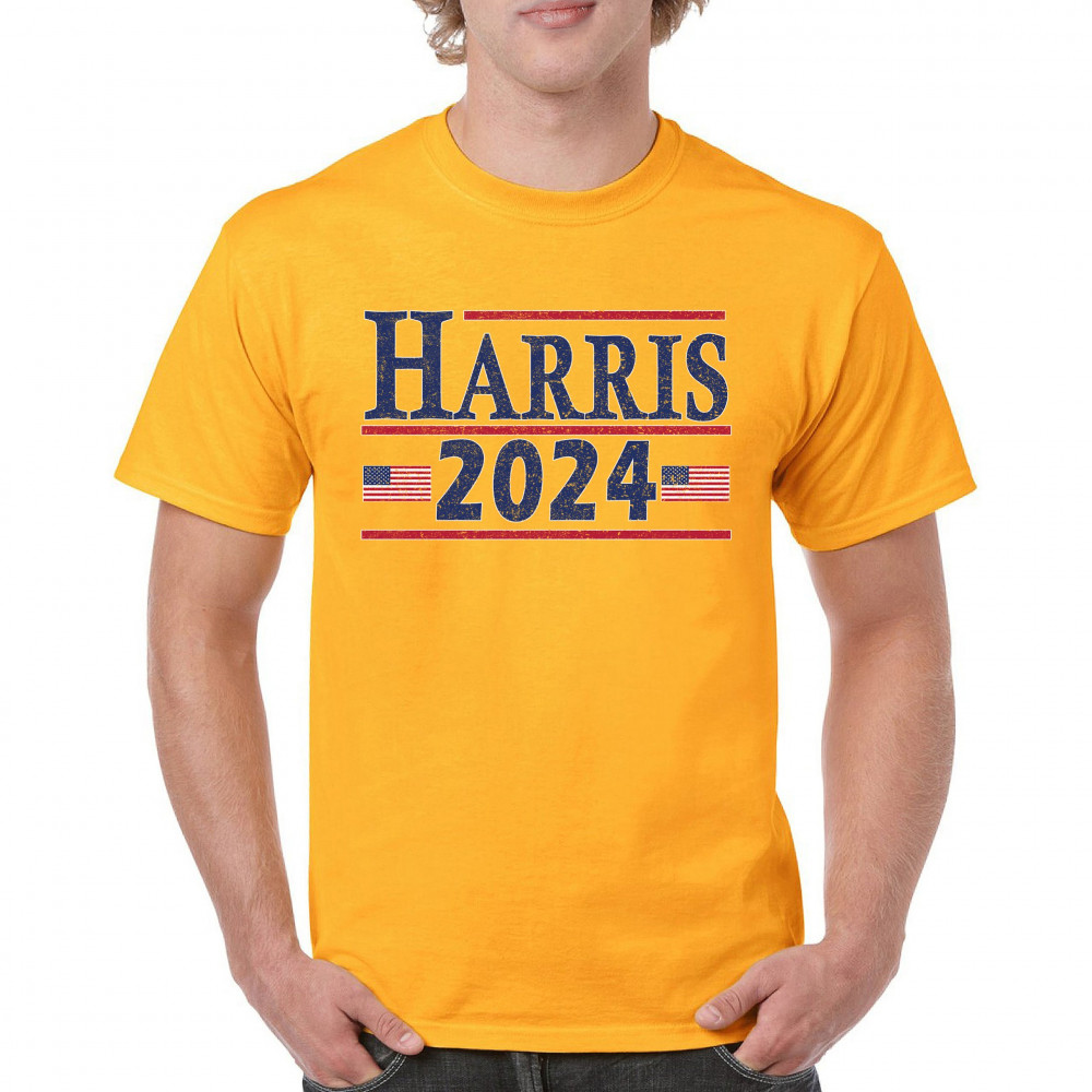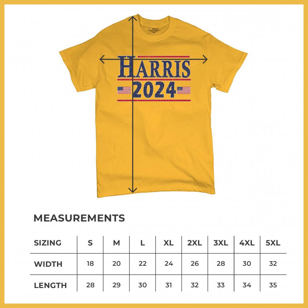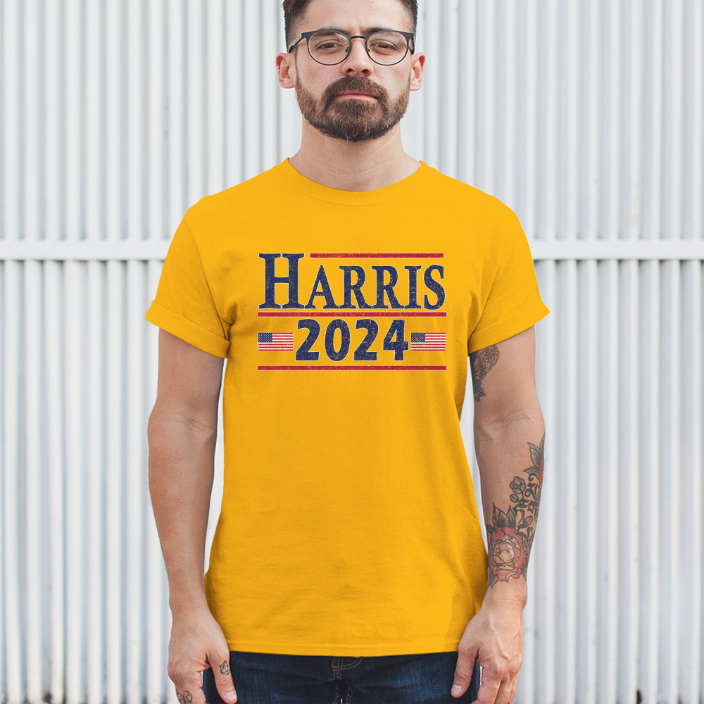 Show your support for Kamala Harris with this bold "Harris 2024" t-shirt, featuring American flags. Perfect for rallies and events. Join the movement today!