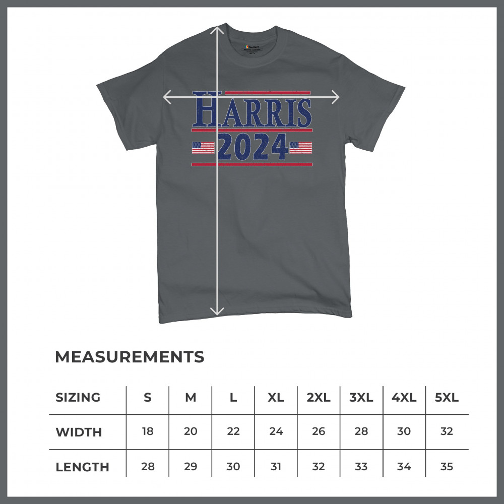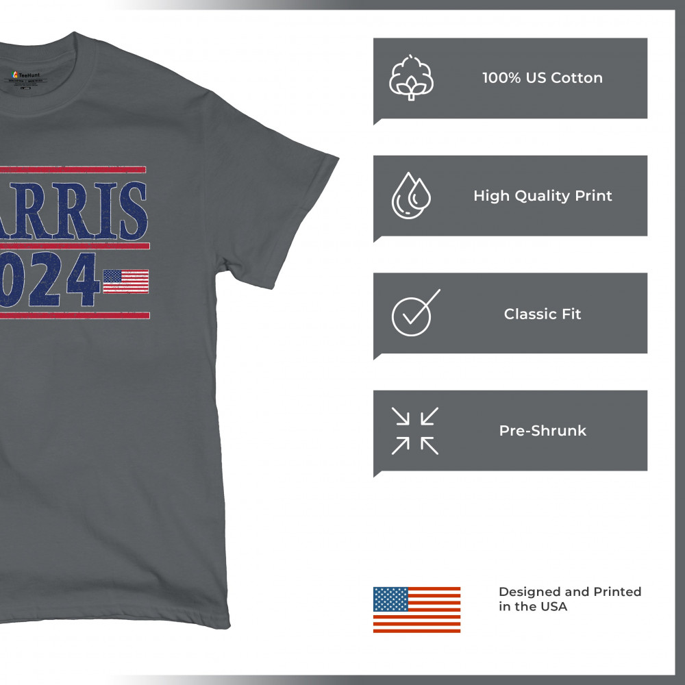 Show your support for Kamala Harris with this bold "Harris 2024" t-shirt, featuring American flags. Perfect for rallies and events. Join the movement today!