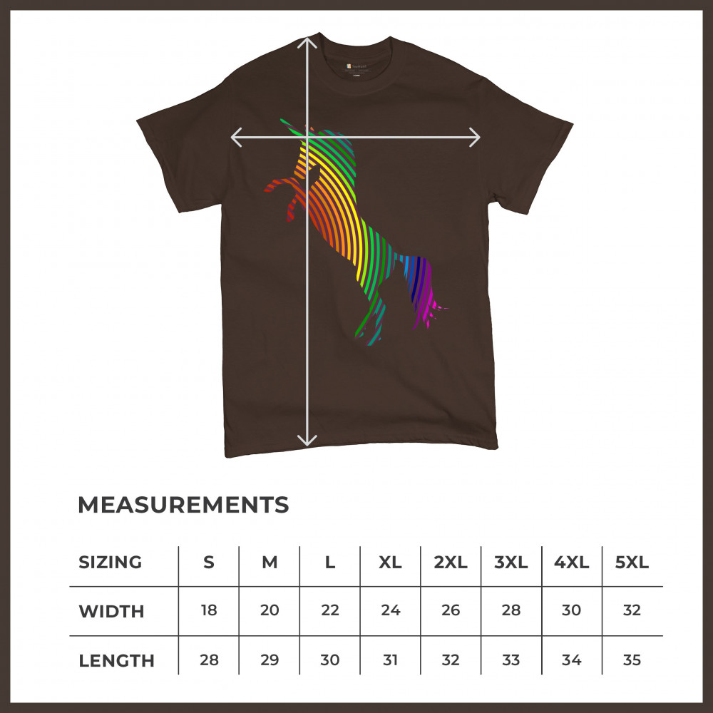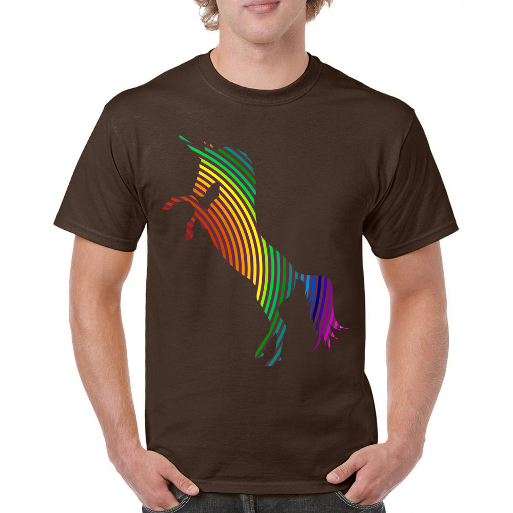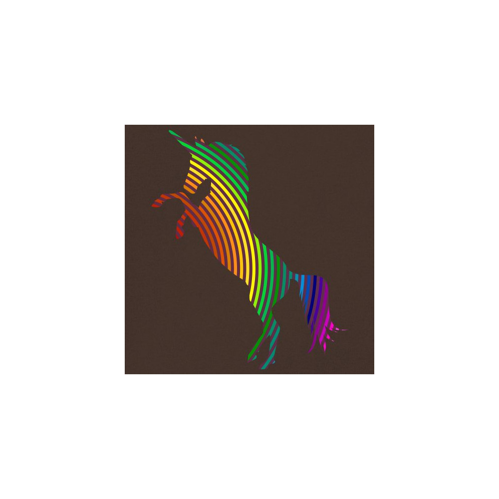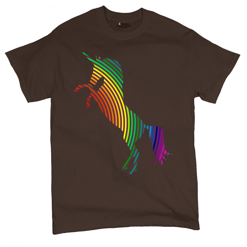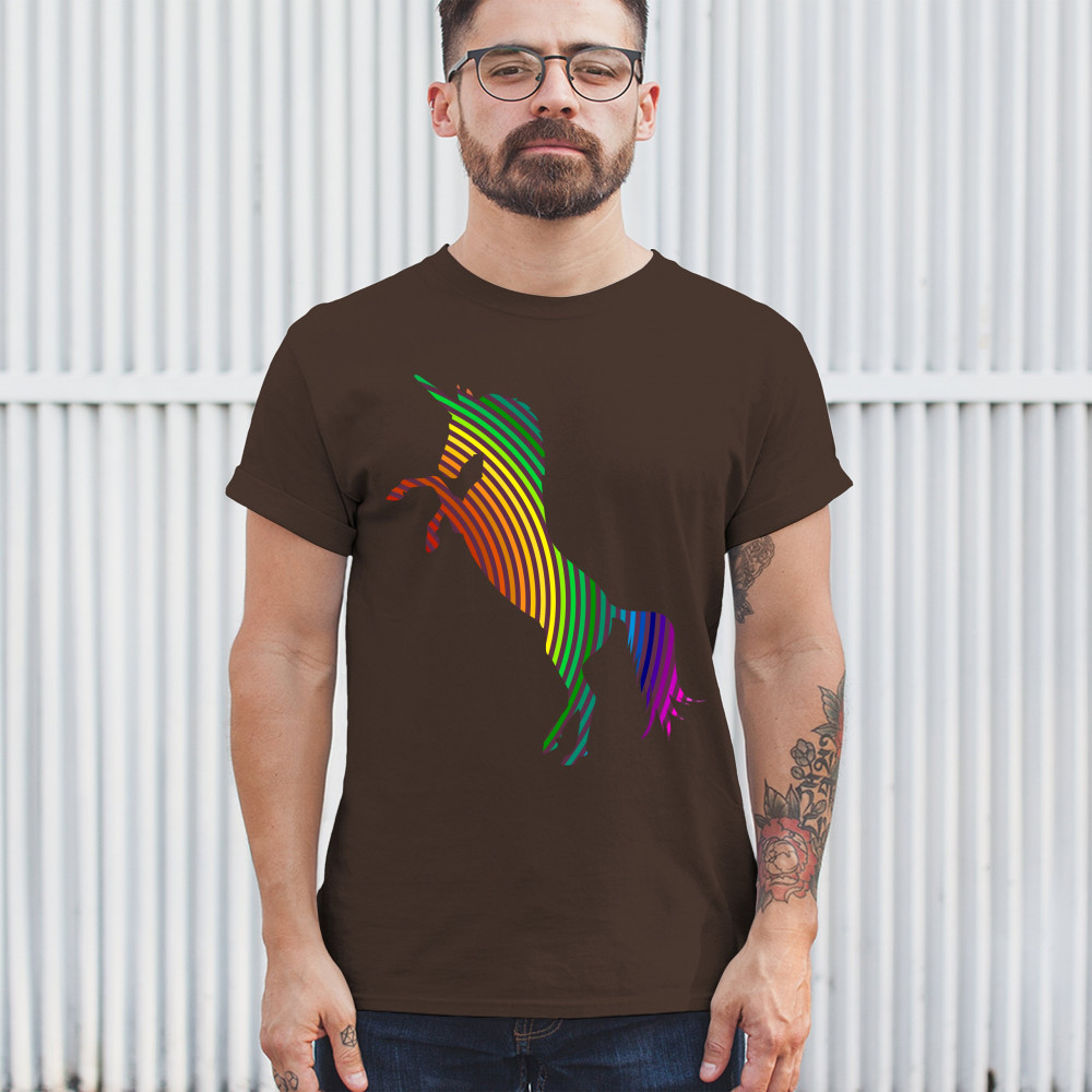 The print depicts a strong rearing unicorn. The unicorn is painted in vivid rainbow-stripe colors. This can symbolize a strong spirit of the sexual and gender minority.