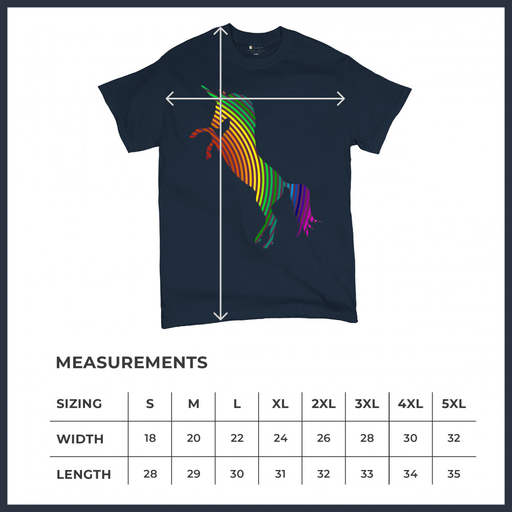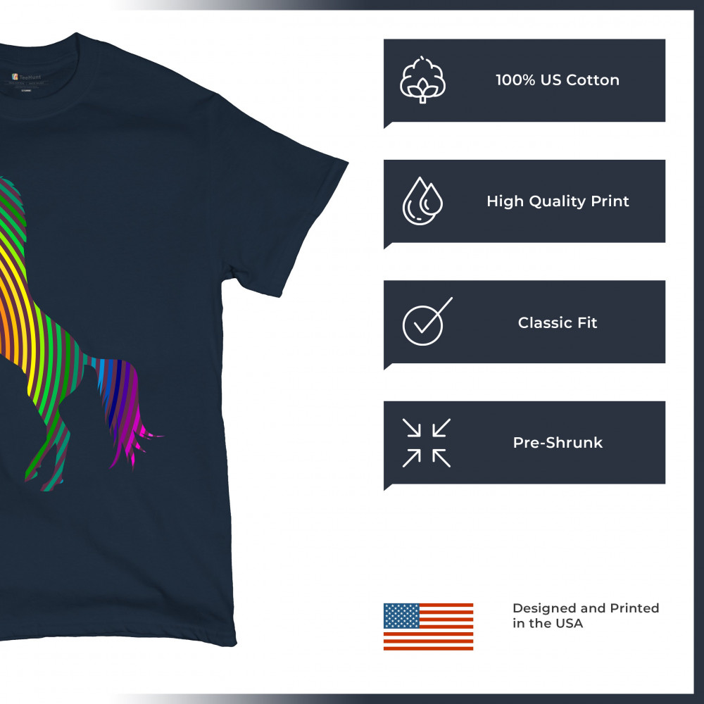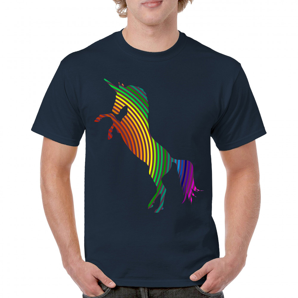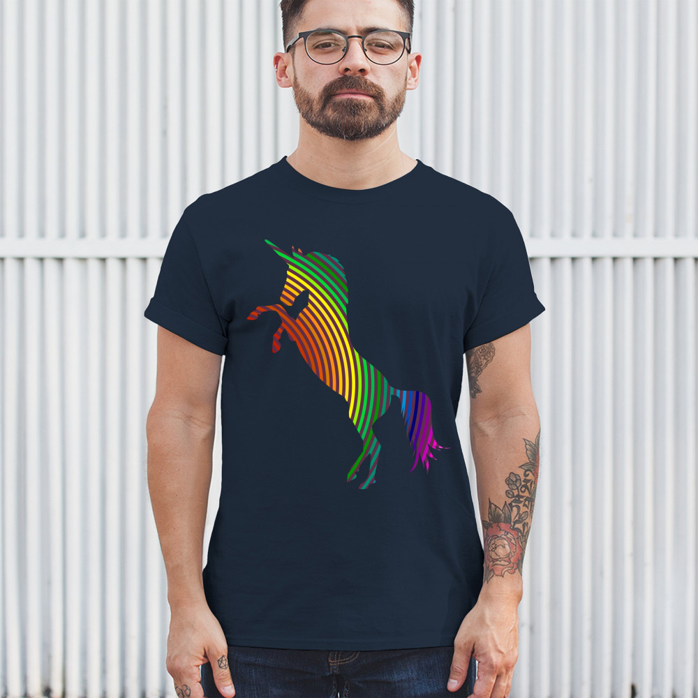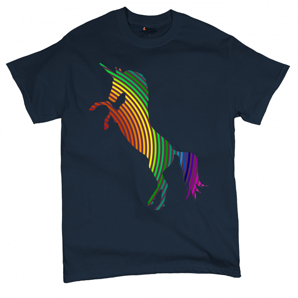 The print depicts a strong rearing unicorn. The unicorn is painted in vivid rainbow-stripe colors. This can symbolize a strong spirit of the sexual and gender minority.