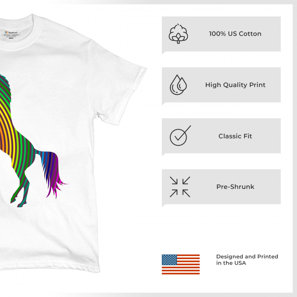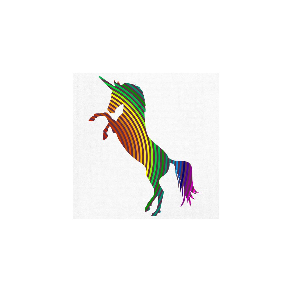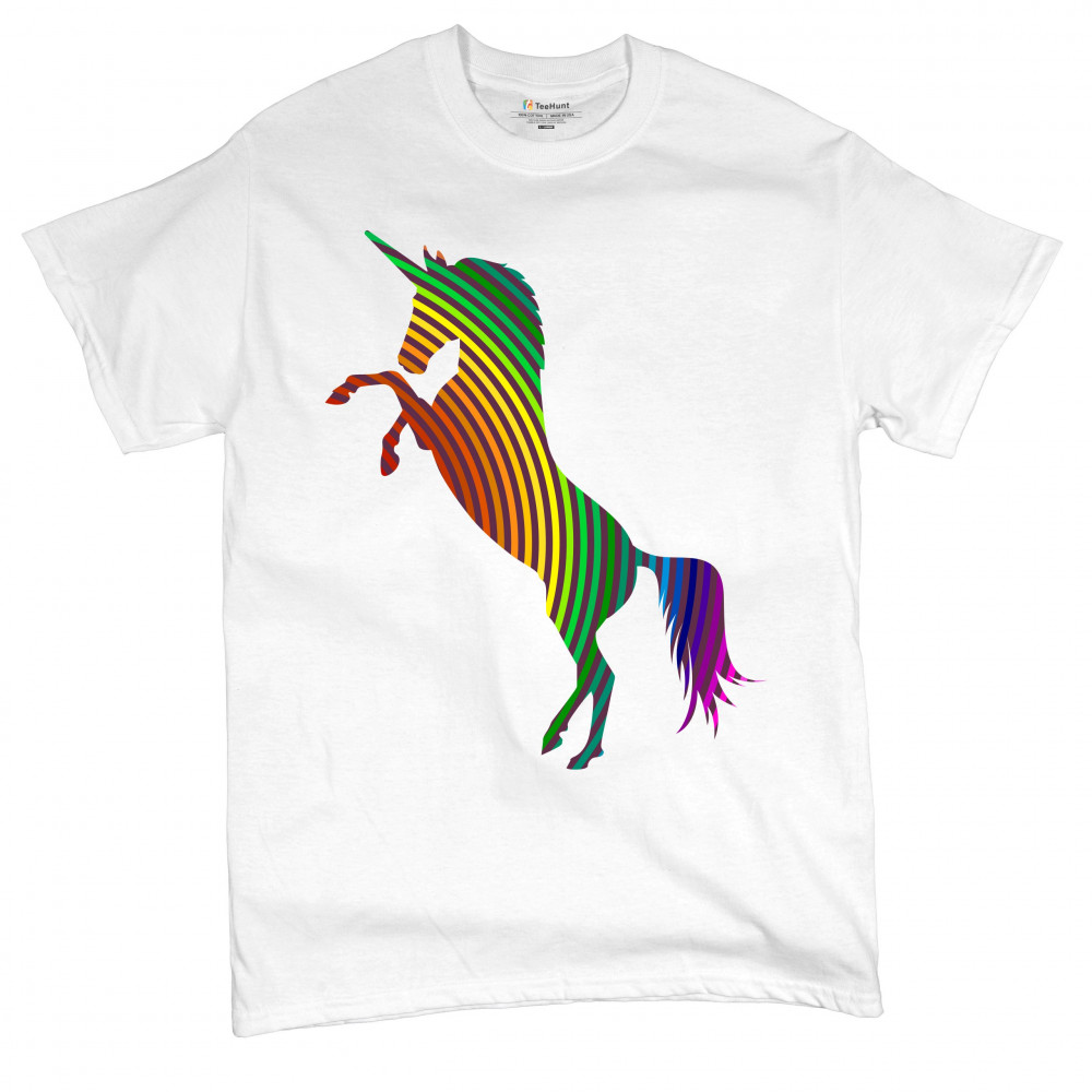 The print depicts a strong rearing unicorn. The unicorn is painted in vivid rainbow-stripe colors. This can symbolize a strong spirit of the sexual and gender minority.