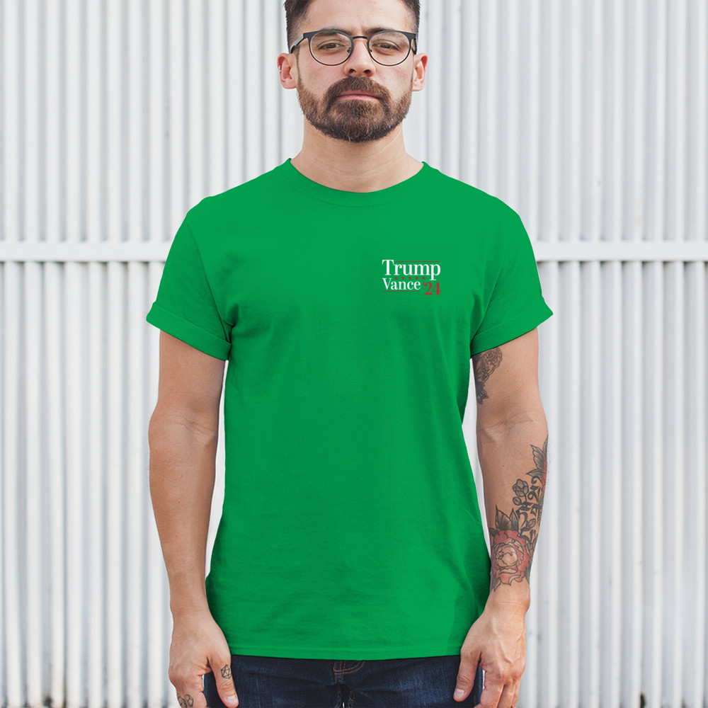 Support the unstoppable Trump and Vance 2024 campaign with this minimalist yet impactful t-shirt. Perfect for conservatives and Trump supporters, this shirt embodies the values of victory, patriotism, and faith in a better future. Whether you're attending a rally or making a statement in your daily life, wear this shirt with pride and confidence, knowing you're part of a movement that puts America first. Embrace your support and show where you stand.