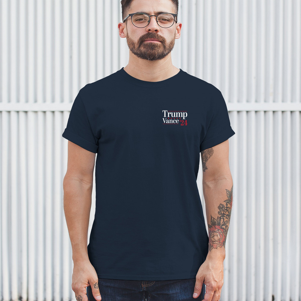 Support the unstoppable Trump and Vance 2024 campaign with this minimalist yet impactful t-shirt. Perfect for conservatives and Trump supporters, this shirt embodies the values of victory, patriotism, and faith in a better future. Whether you're attending a rally or making a statement in your daily life, wear this shirt with pride and confidence, knowing you're part of a movement that puts America first. Embrace your support and show where you stand.