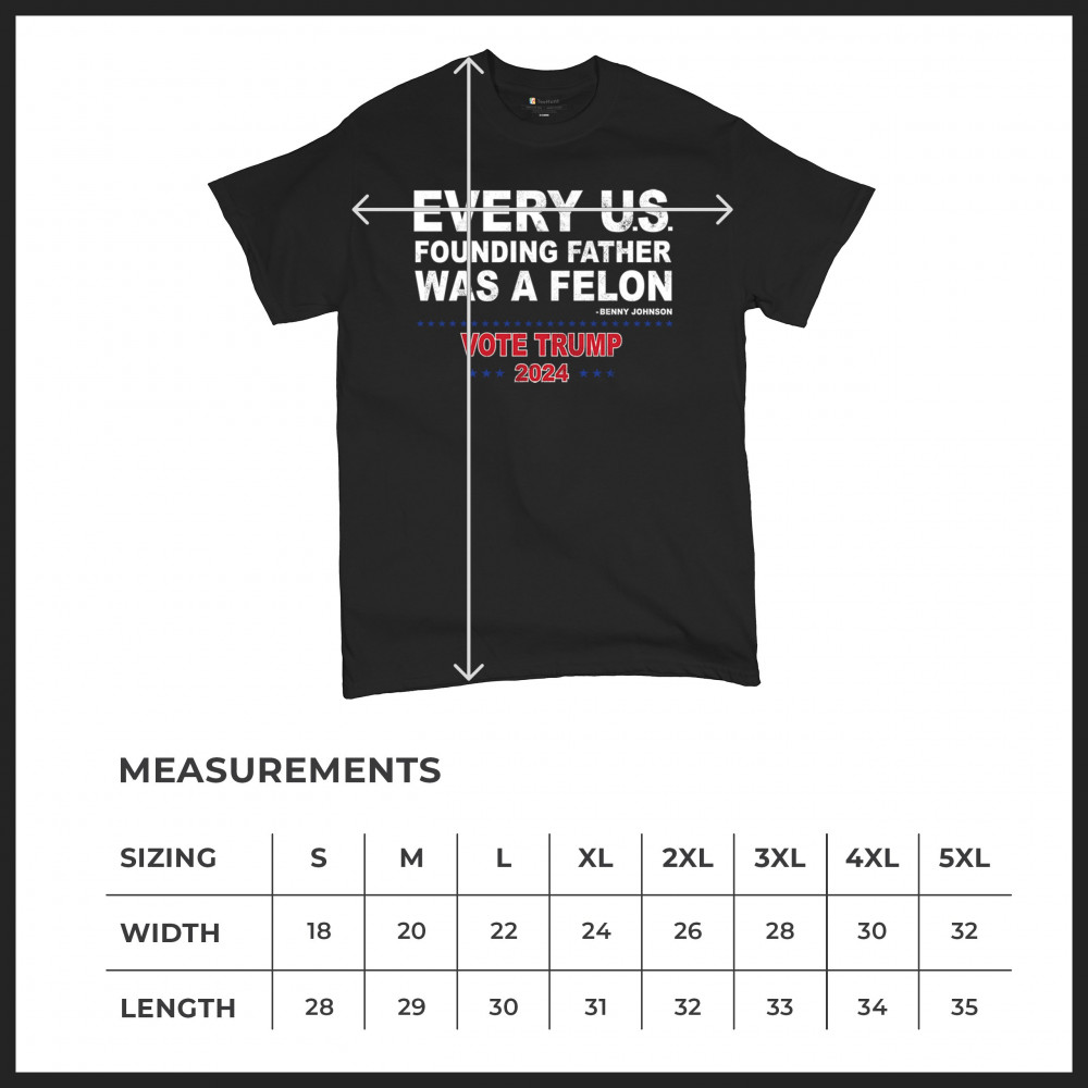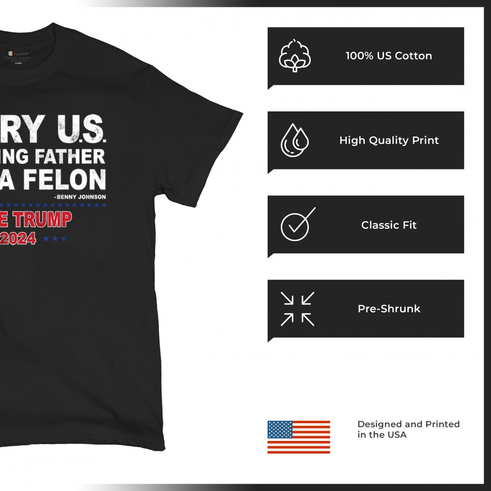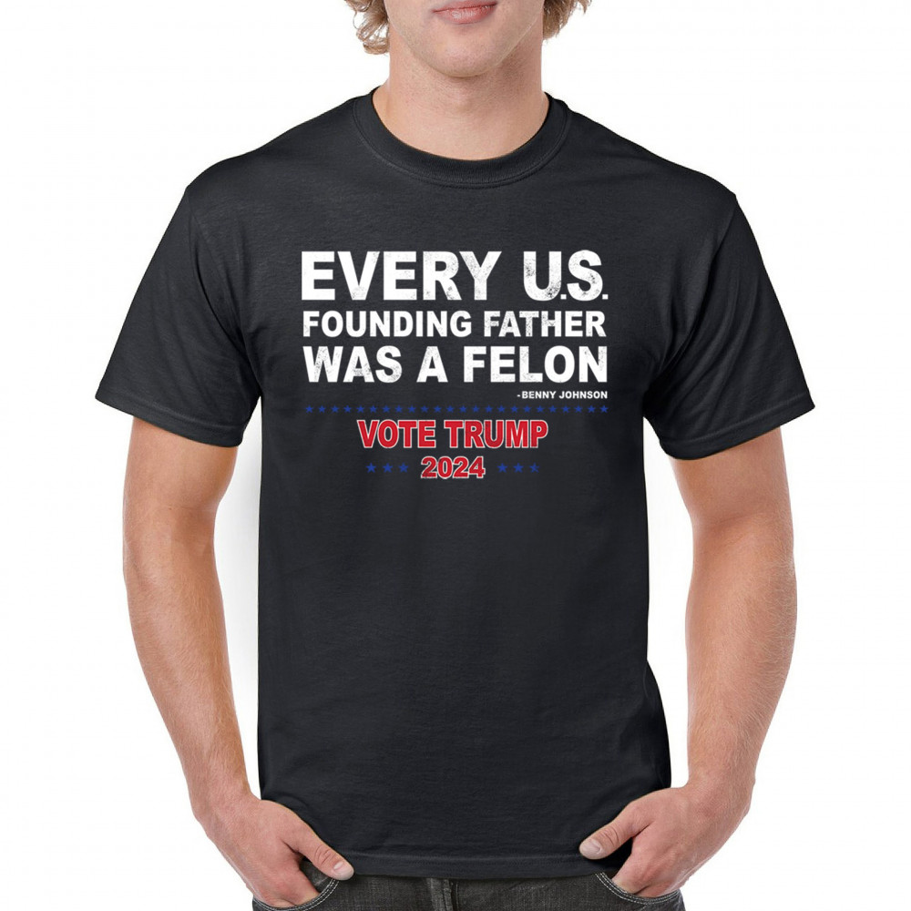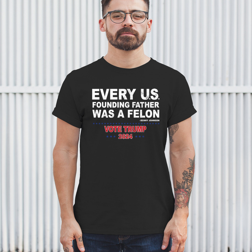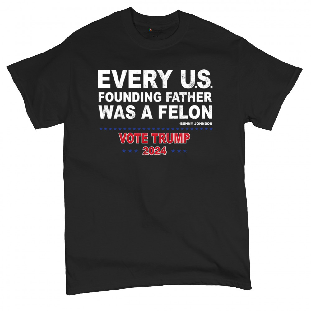 Show your support for Trump 2024 with a bold design quoting "Every U.S. founding father was a felon." Stand against political attacks and support an America-first vision.