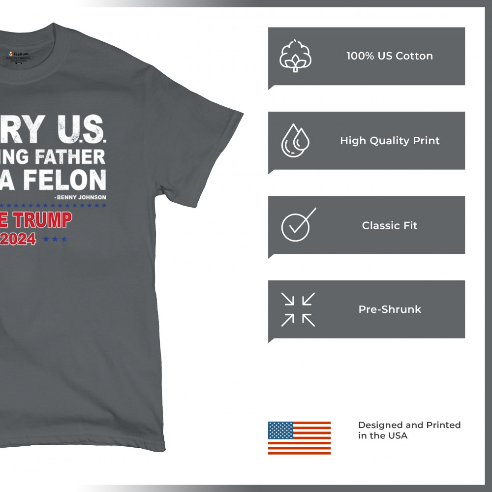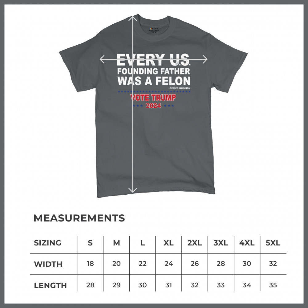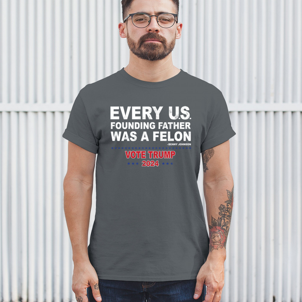 Show your support for Trump 2024 with a bold design quoting "Every U.S. founding father was a felon." Stand against political attacks and support an America-first vision.