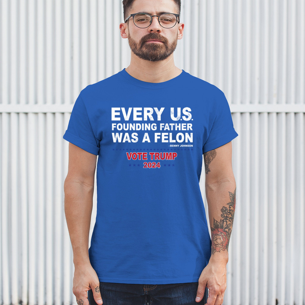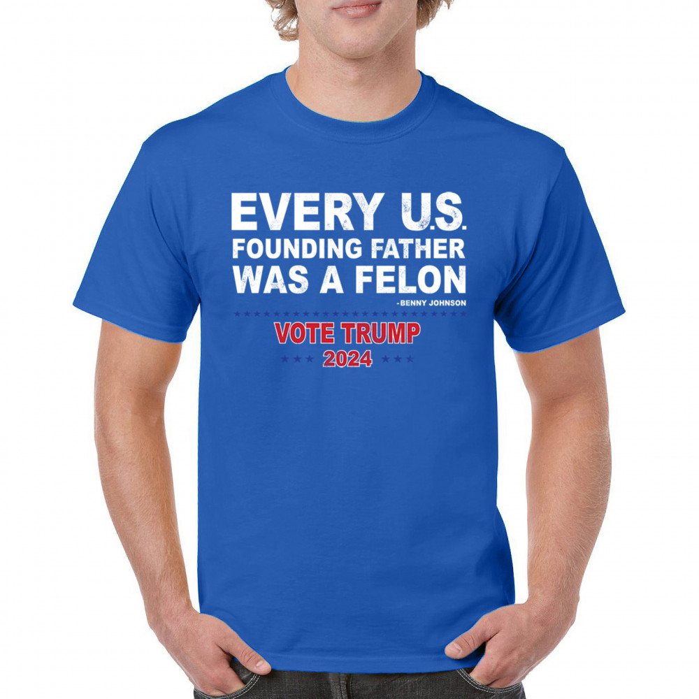 Show your support for Trump 2024 with a bold design quoting "Every U.S. founding father was a felon." Stand against political attacks and support an America-first vision.