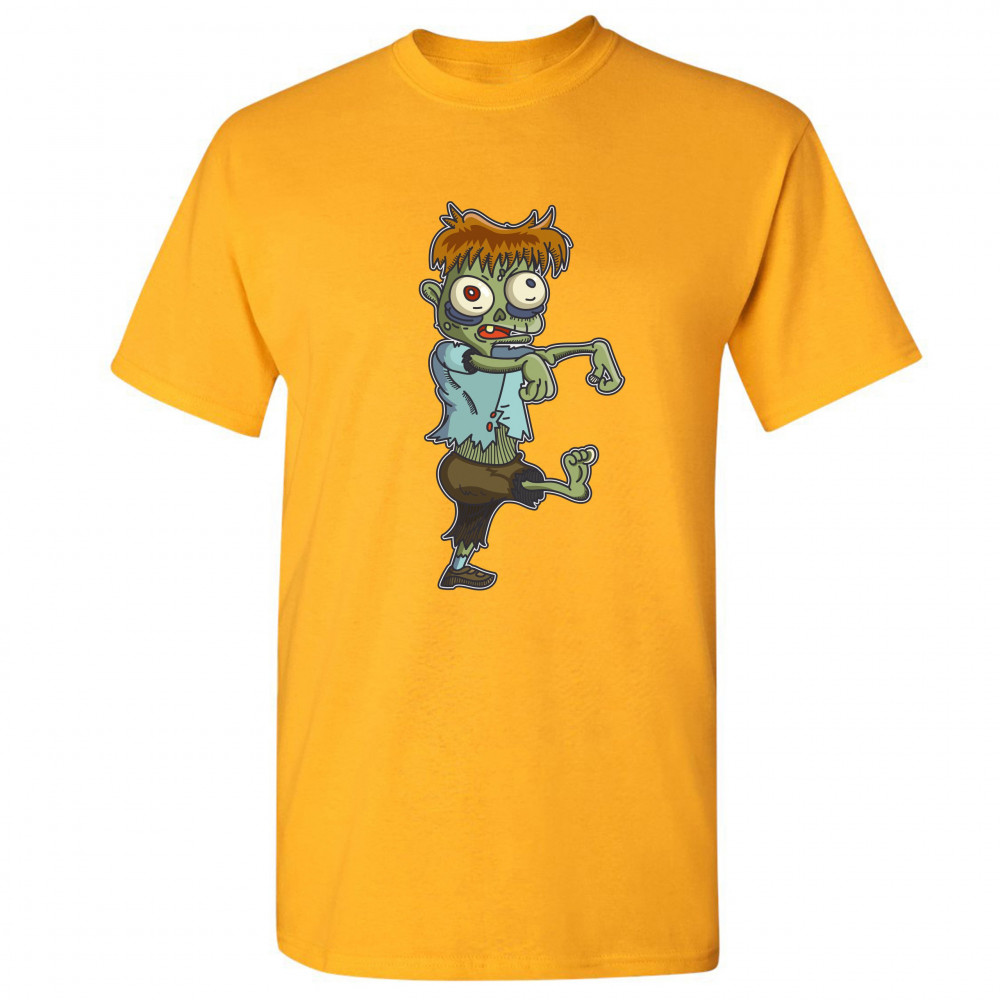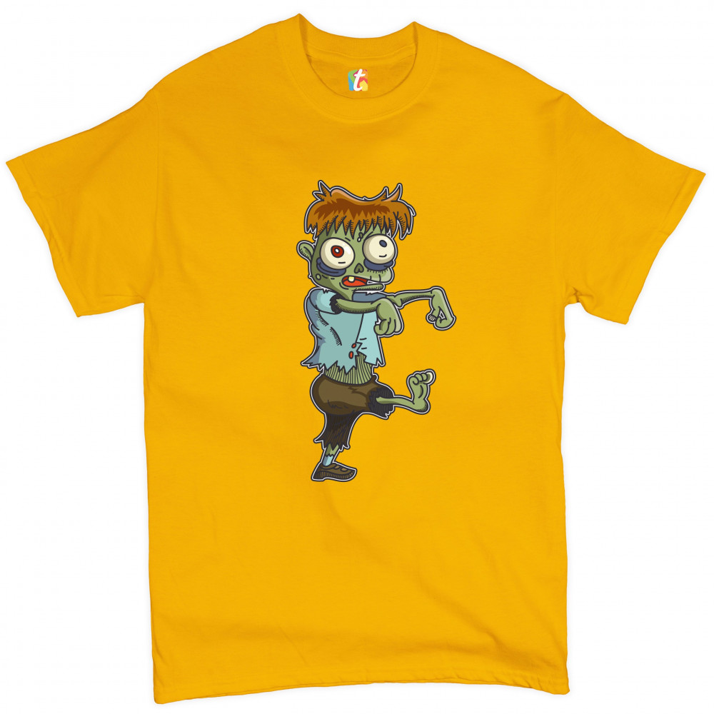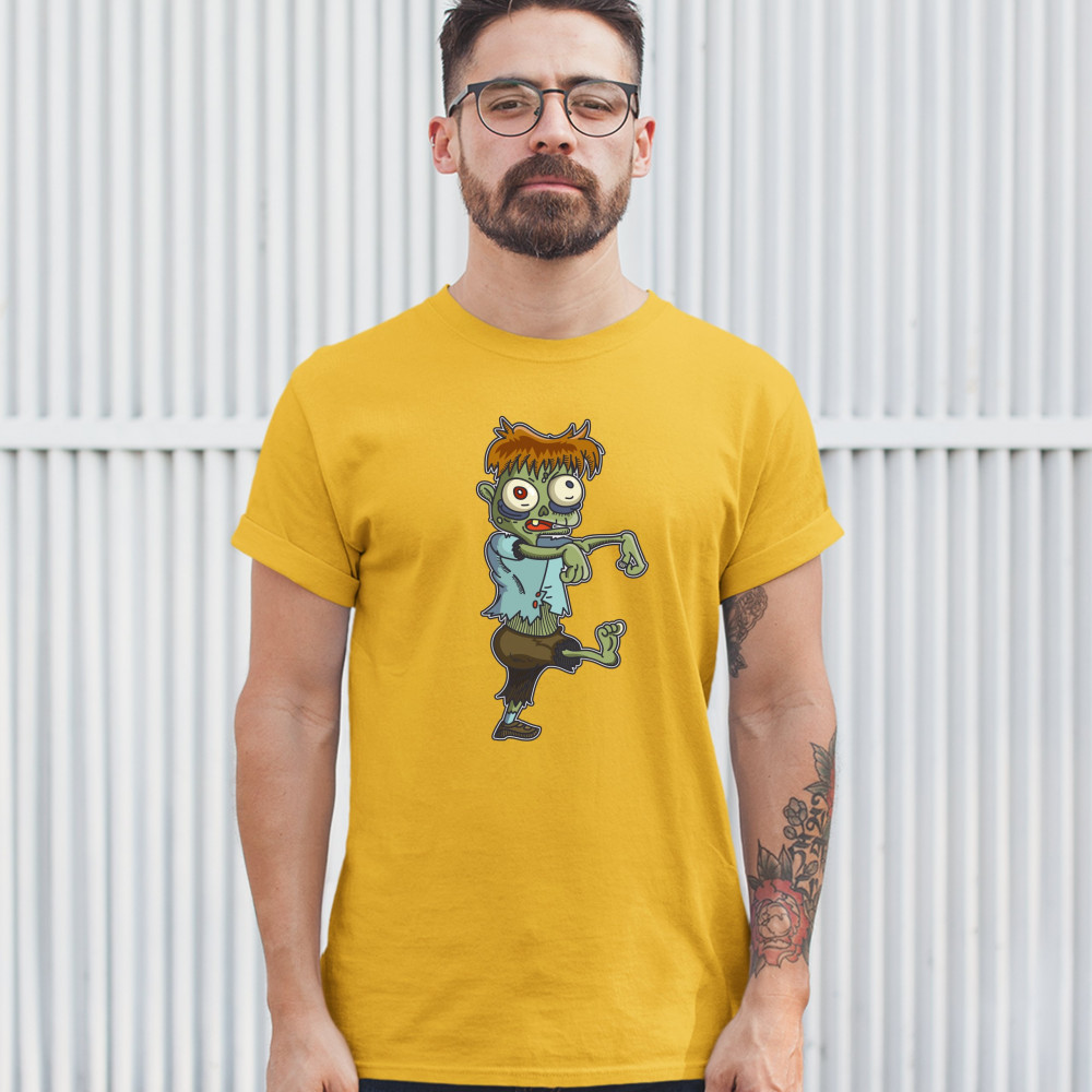 A print featuring a zombie, walking in a stereotypical movie fashion with the arms extended forward. The zombie has messy ginger hair and eyes popping out but he looks rather funny and non-threatening. A great choice for a person who is into horror movies