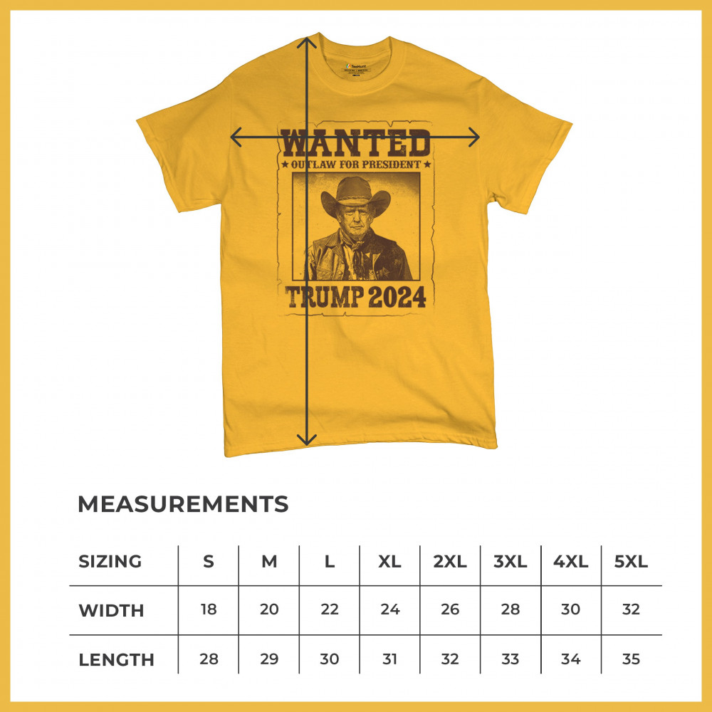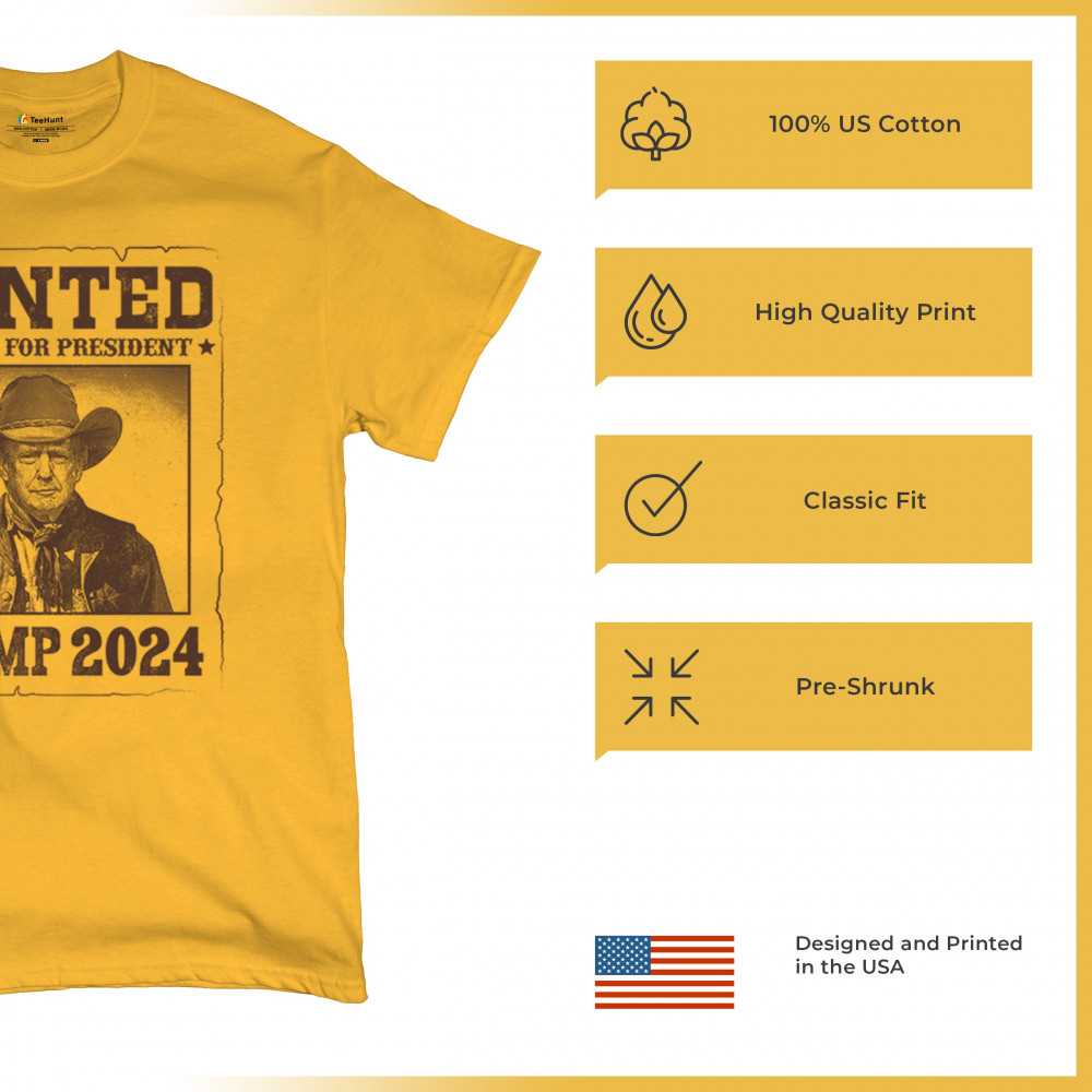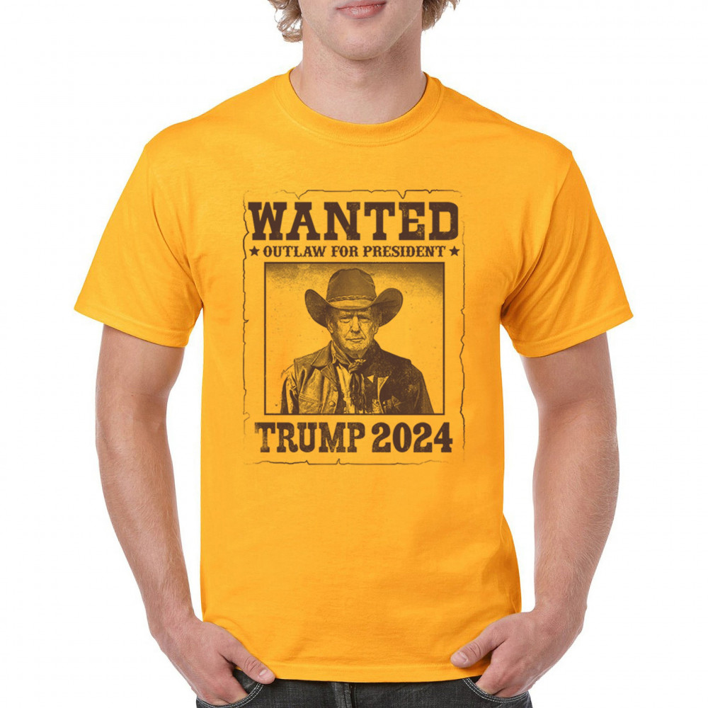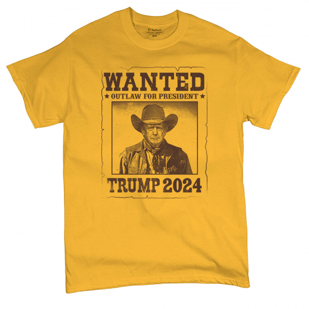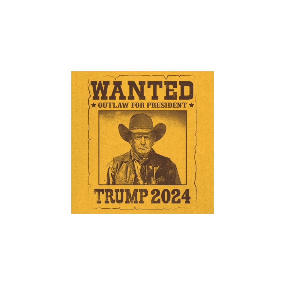 Bold "Wanted: Outlaw for President" design featuring Trump in cowboy attire, perfect for rally-goers and supporters. Express your support for the 2024 election.