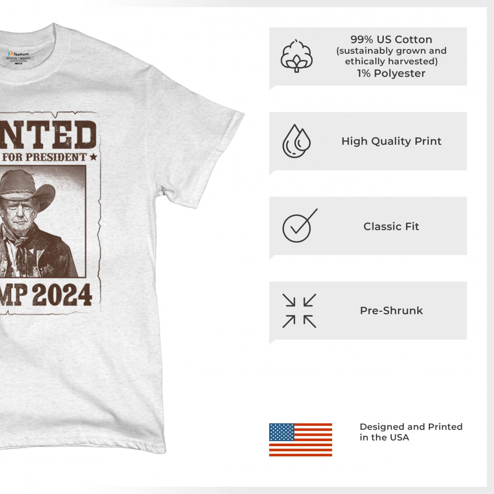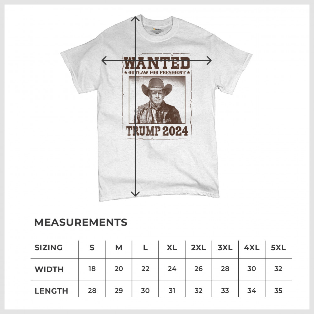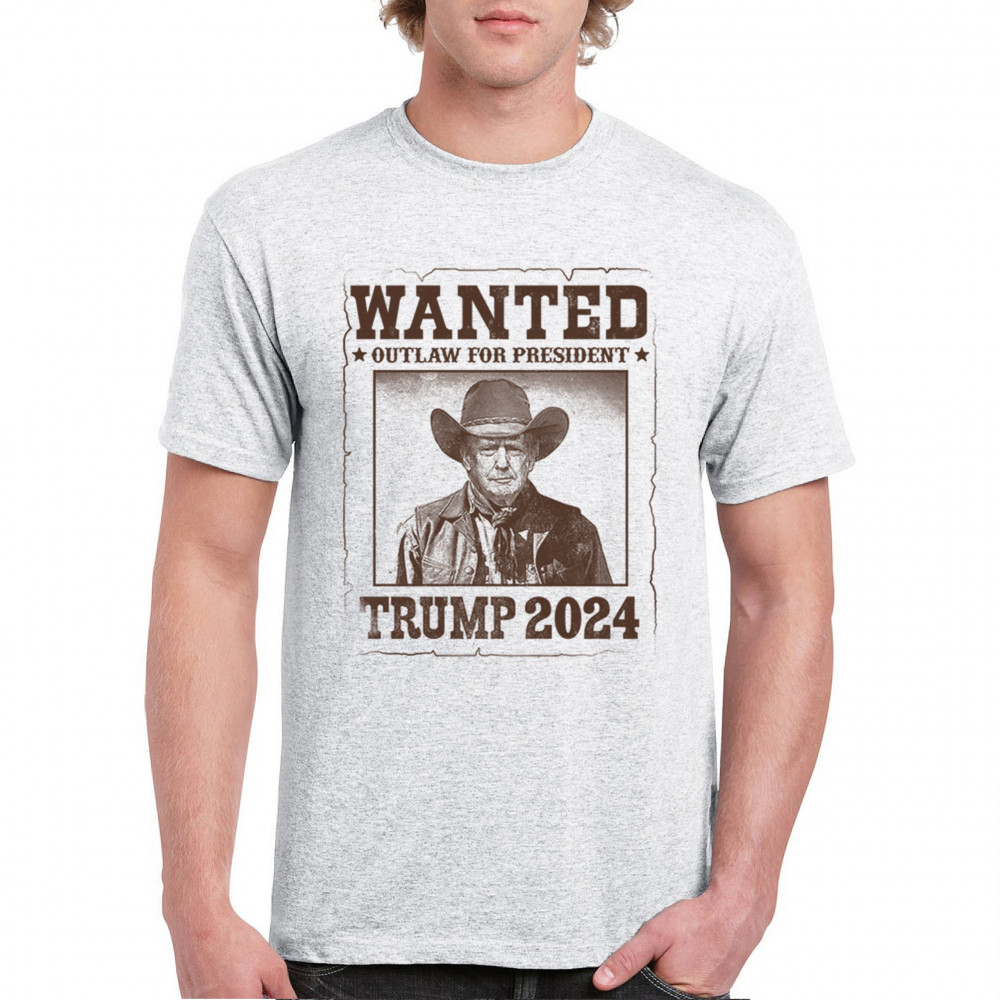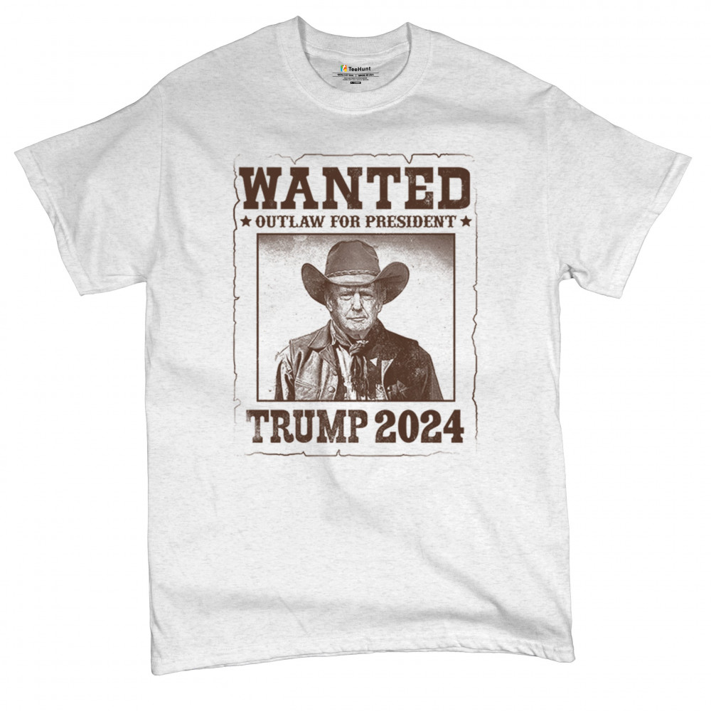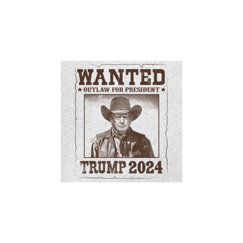 Bold "Wanted: Outlaw for President" design featuring Trump in cowboy attire, perfect for rally-goers and supporters. Express your support for the 2024 election.