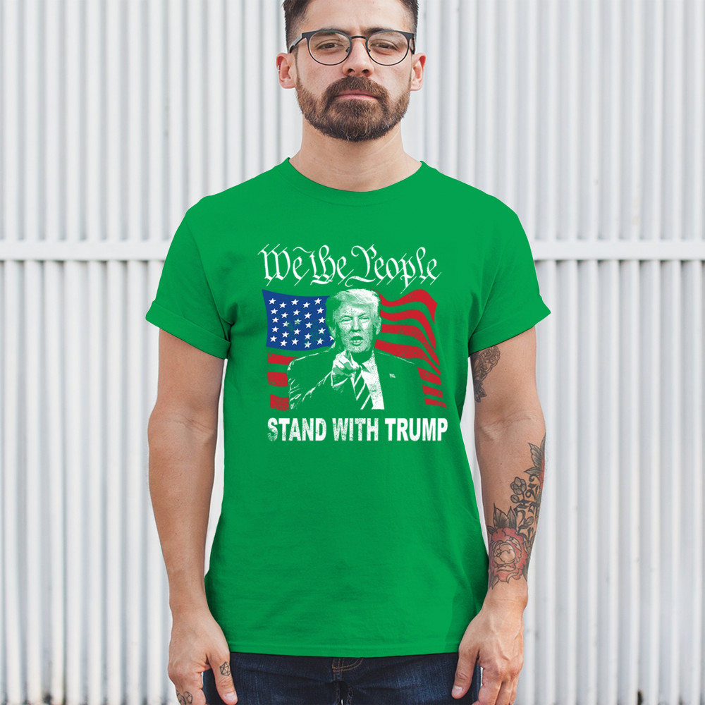 Show your support for Trump with the "We the People Stand with Trump" design. A powerful symbol of patriotism, featuring Trump and the American flag. Stand up for conservative values.