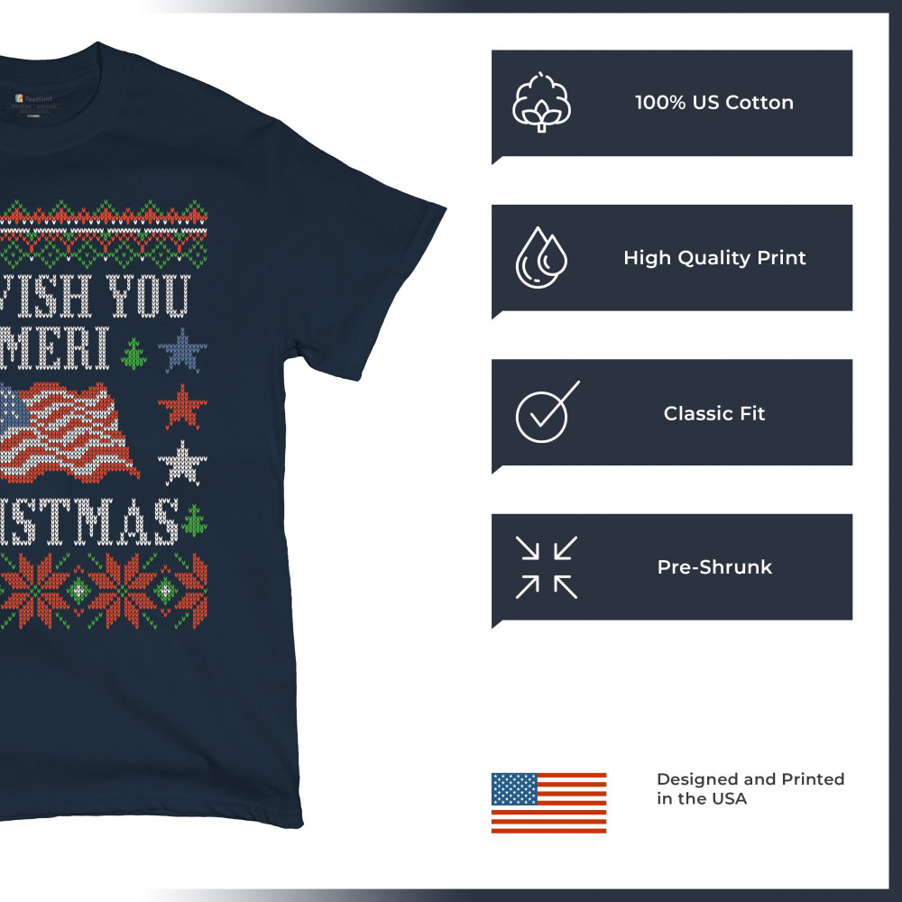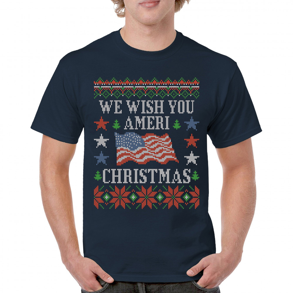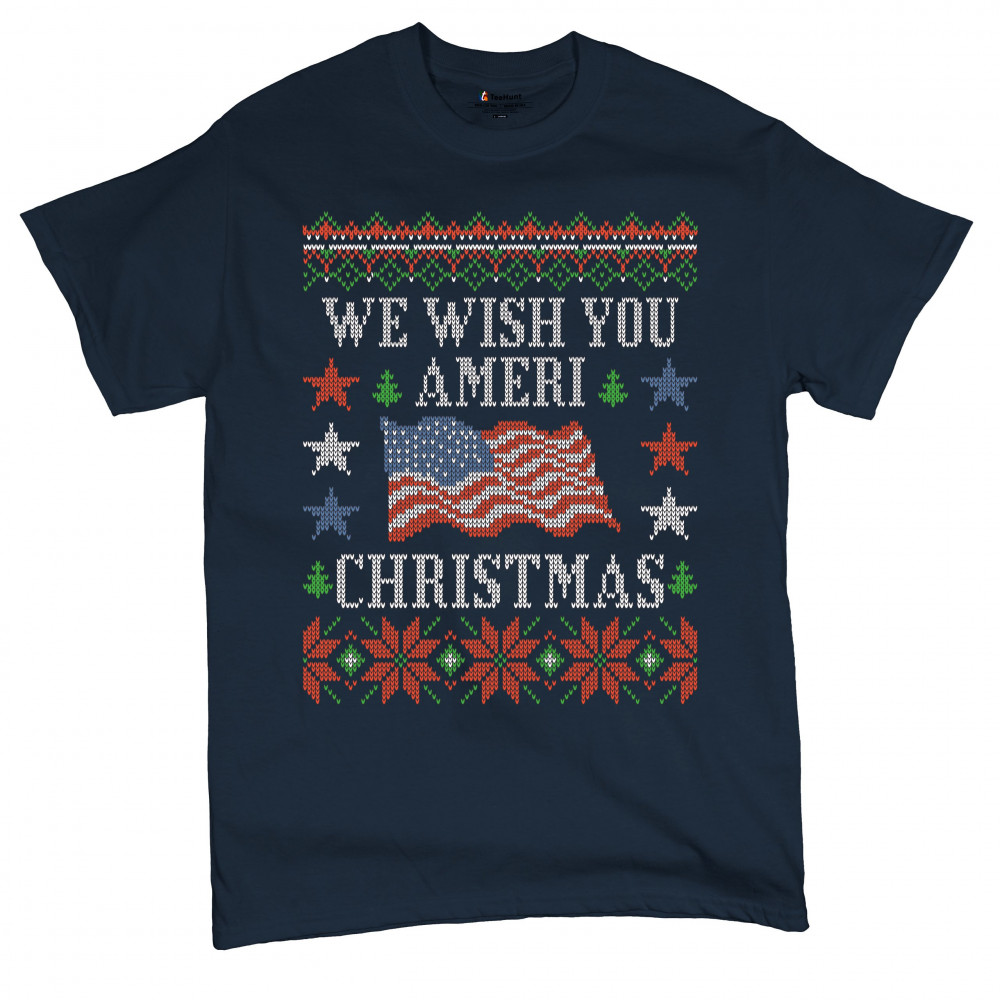 WE WISH YOU AMERI CHRISTMAS t-shirt ugly sweater american flag men's tee navy blue