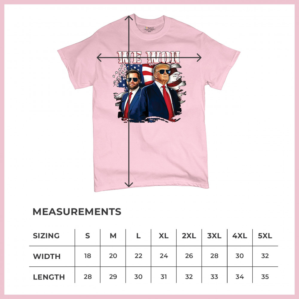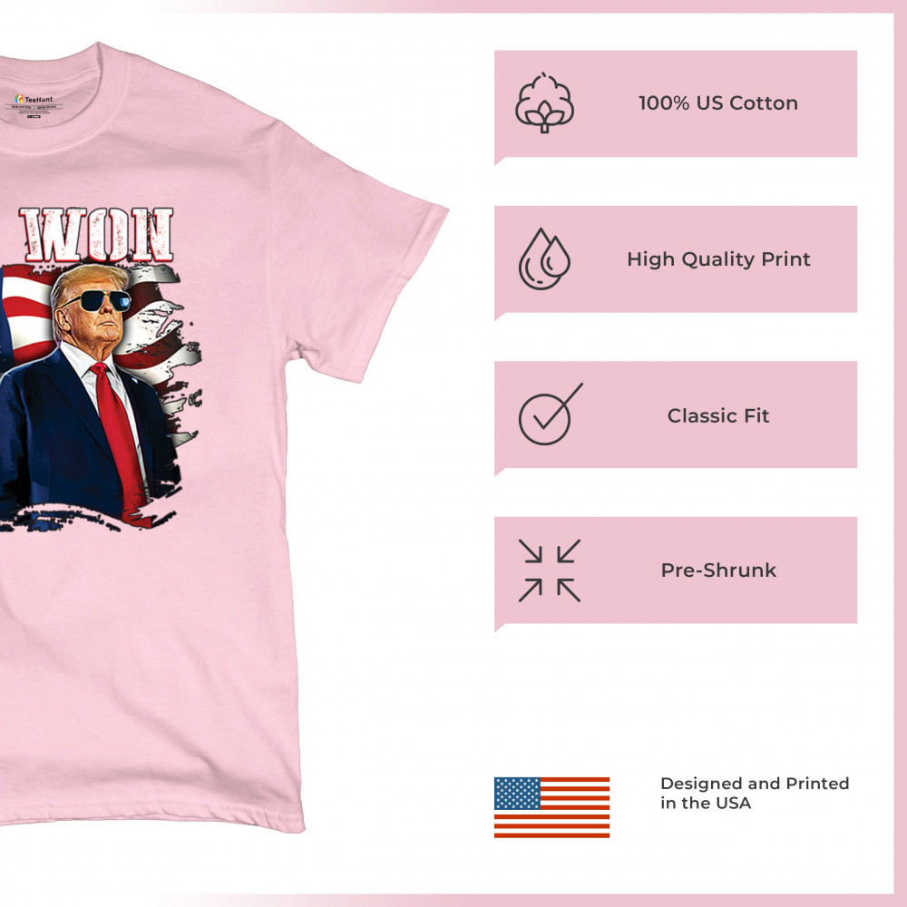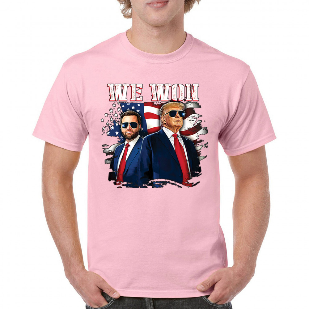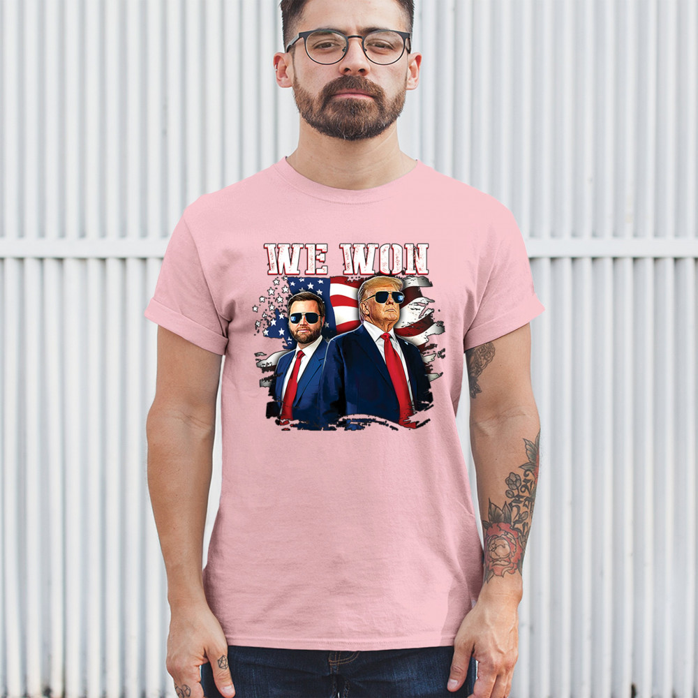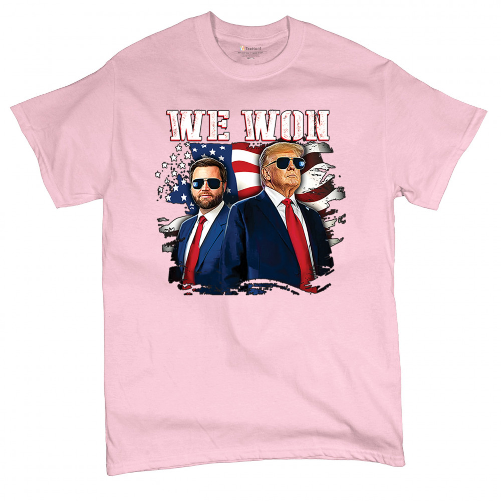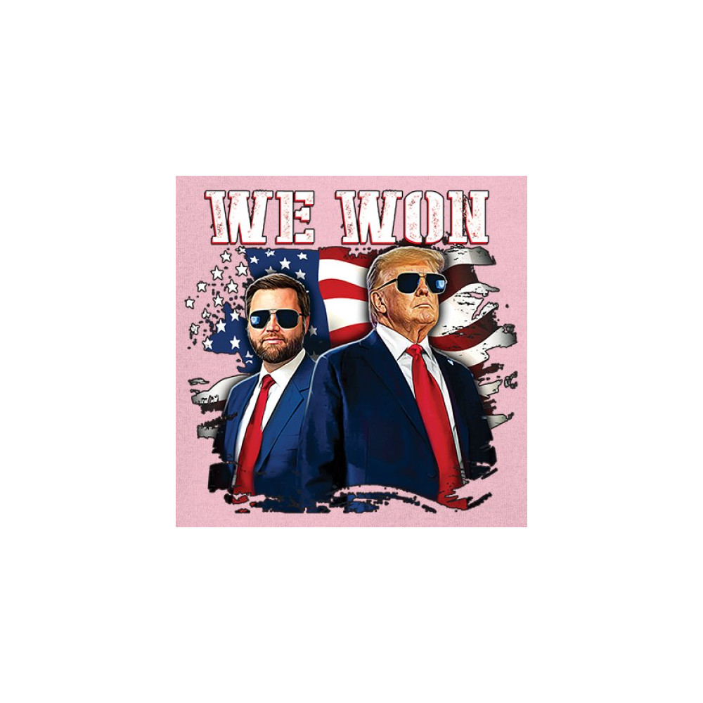 Celebrate Republican victory with this bold "We Won" design featuring Trump and patriotic flair—perfect for rallies, events, and patriotic pride.