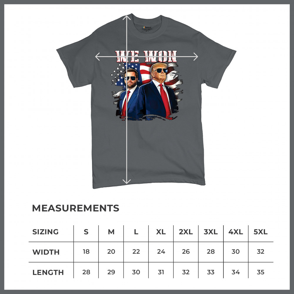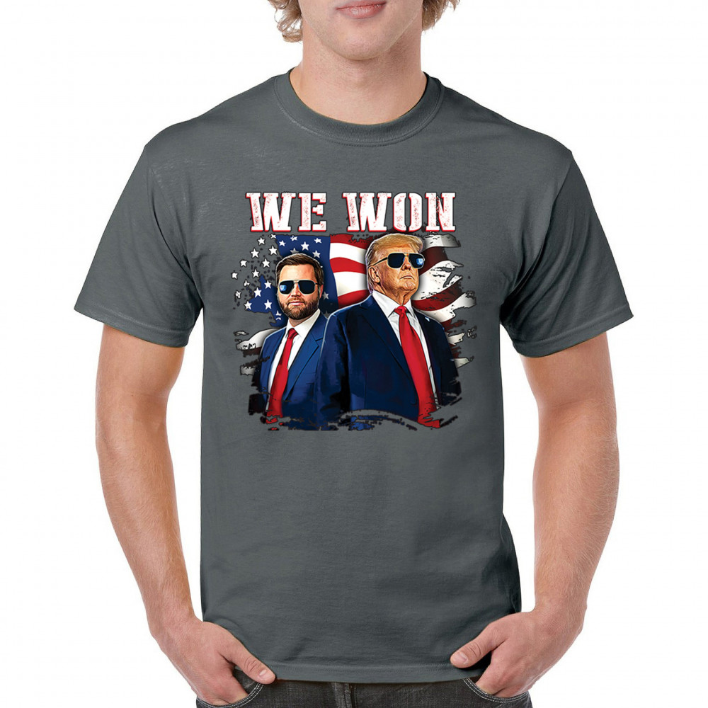 Celebrate Republican victory with this bold "We Won" design featuring Trump and patriotic flair—perfect for rallies, events, and patriotic pride.