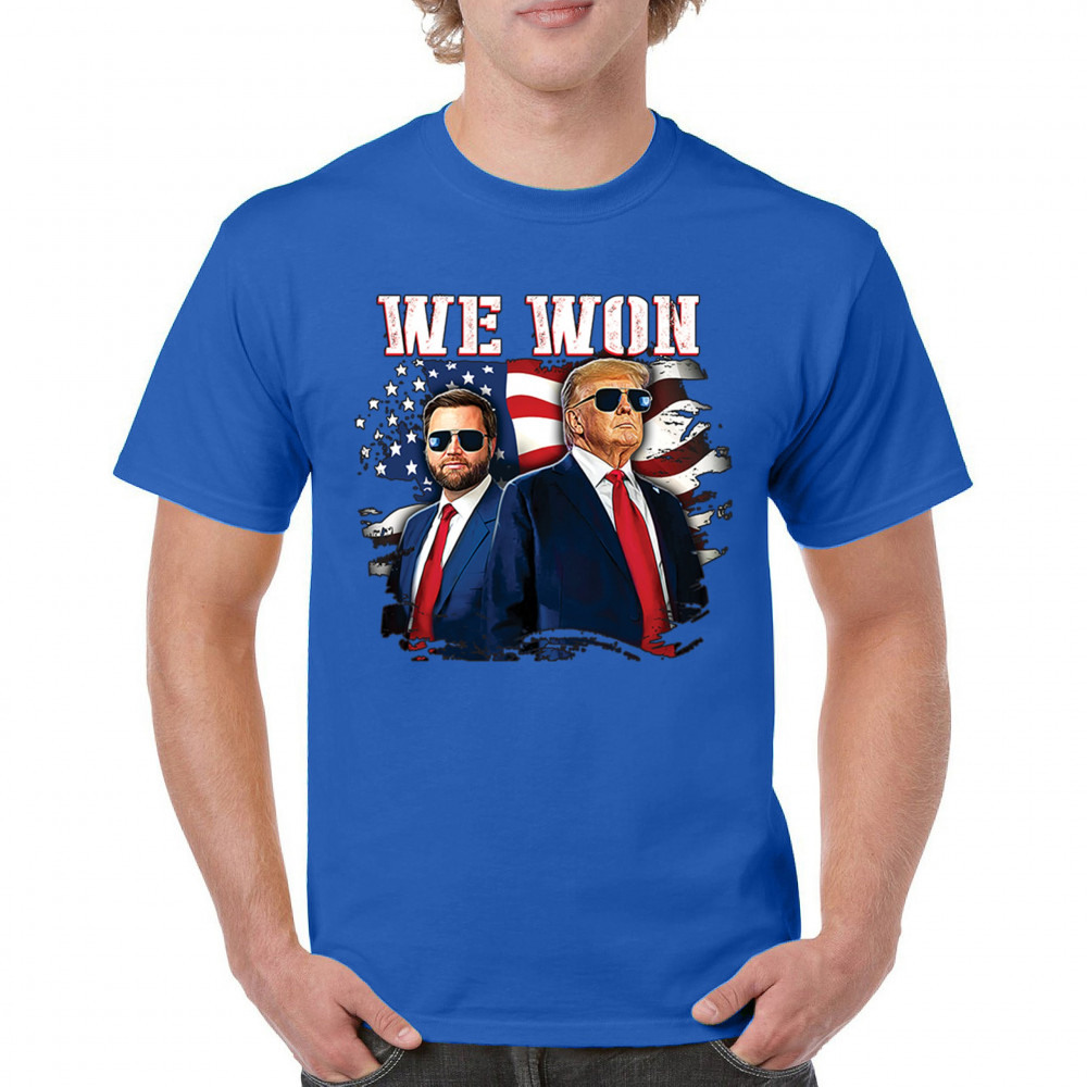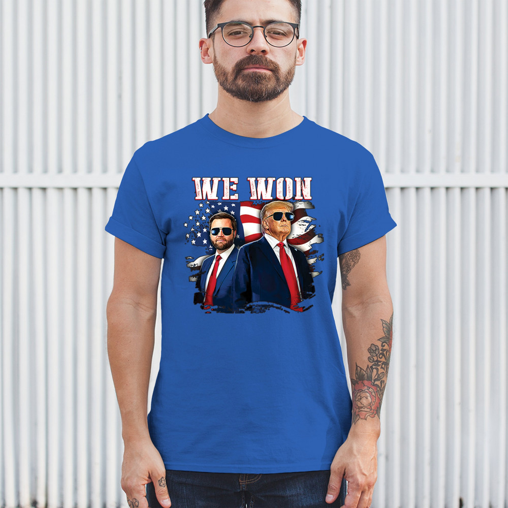 Celebrate Republican victory with this bold "We Won" design featuring Trump and patriotic flair—perfect for rallies, events, and patriotic pride.