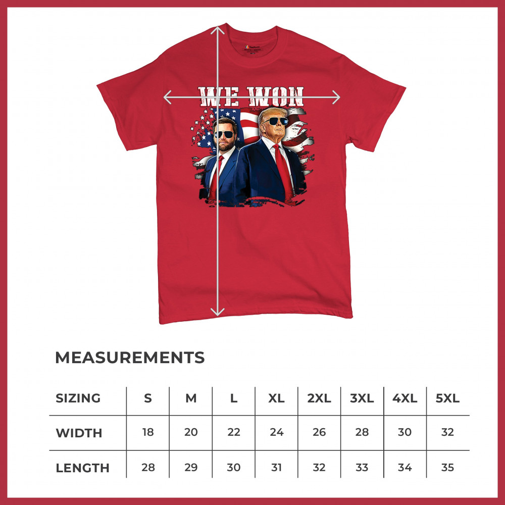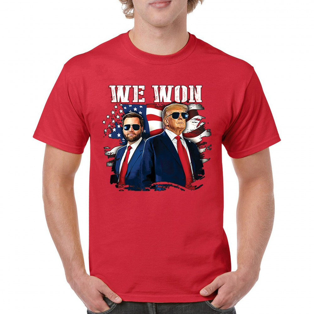 Celebrate Republican victory with this bold "We Won" design featuring Trump and patriotic flair—perfect for rallies, events, and patriotic pride.