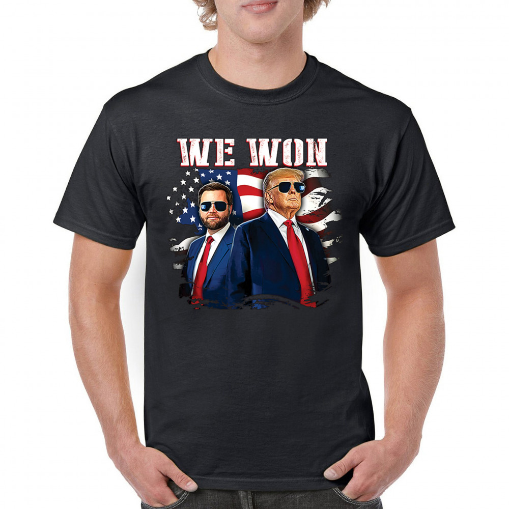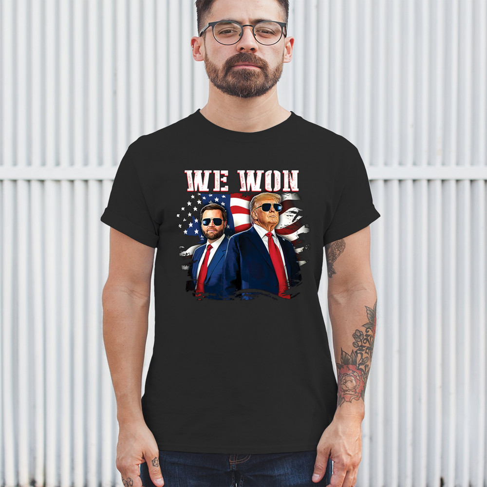 Celebrate Republican victory with this bold "We Won" design featuring Trump and patriotic flair—perfect for rallies, events, and patriotic pride.