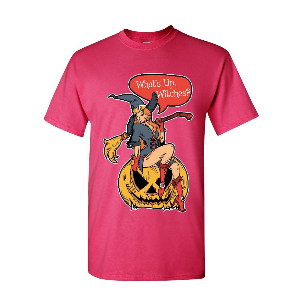 WHAT'S UP WITCHES? what's up witches t-shirt halloween sexy witch jack-o-lantern mens tee shirt hot pink