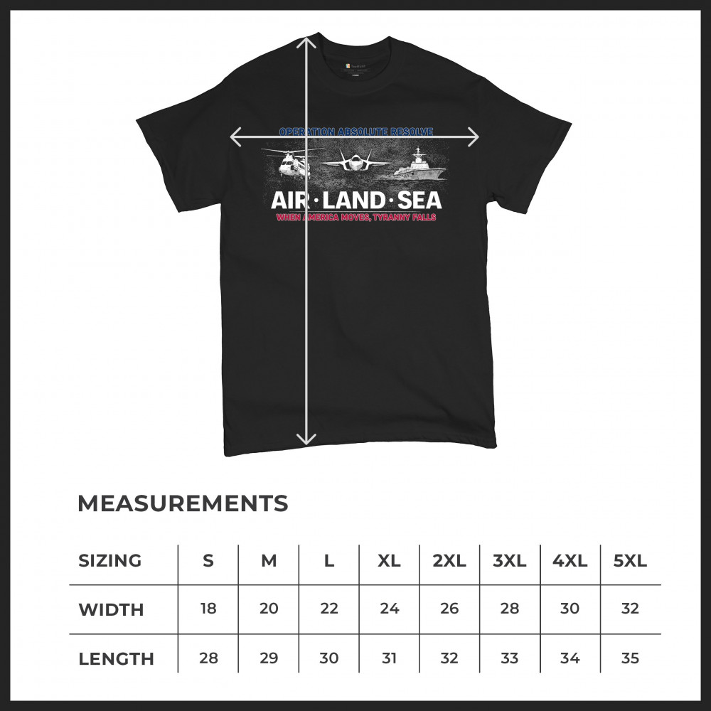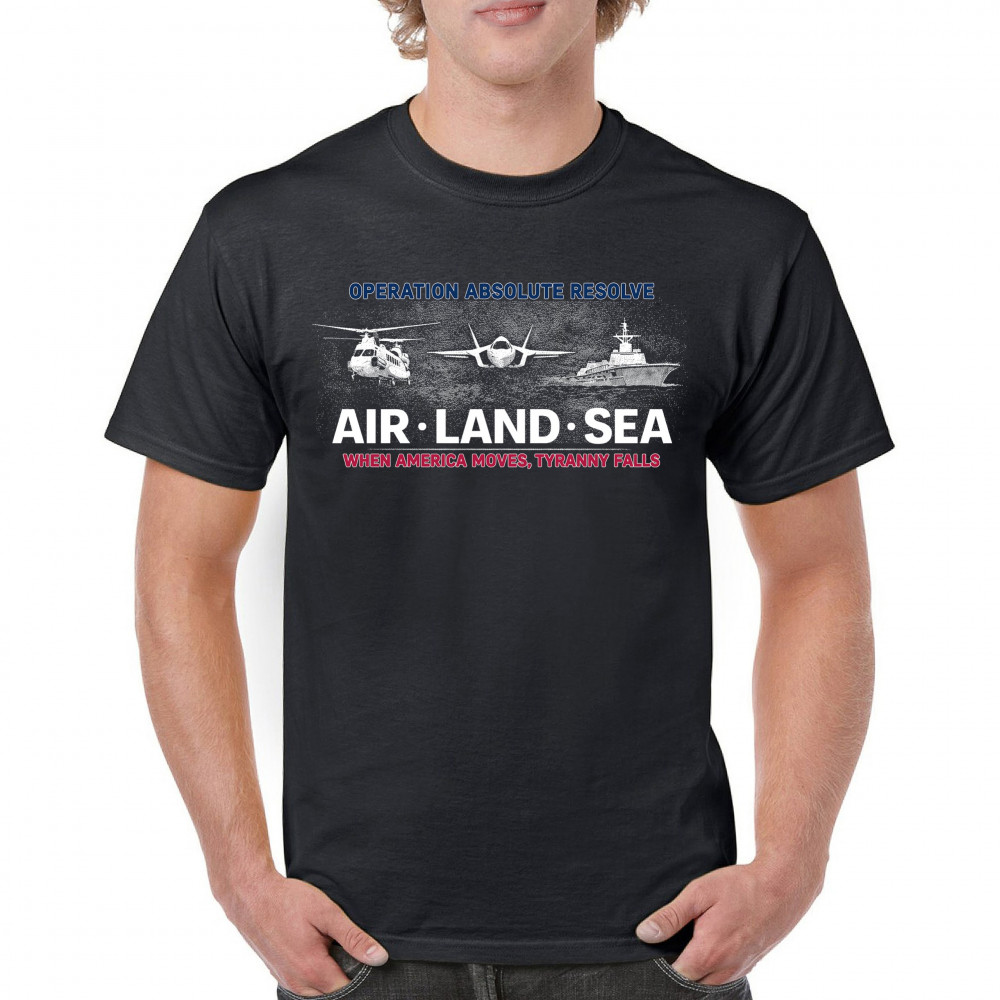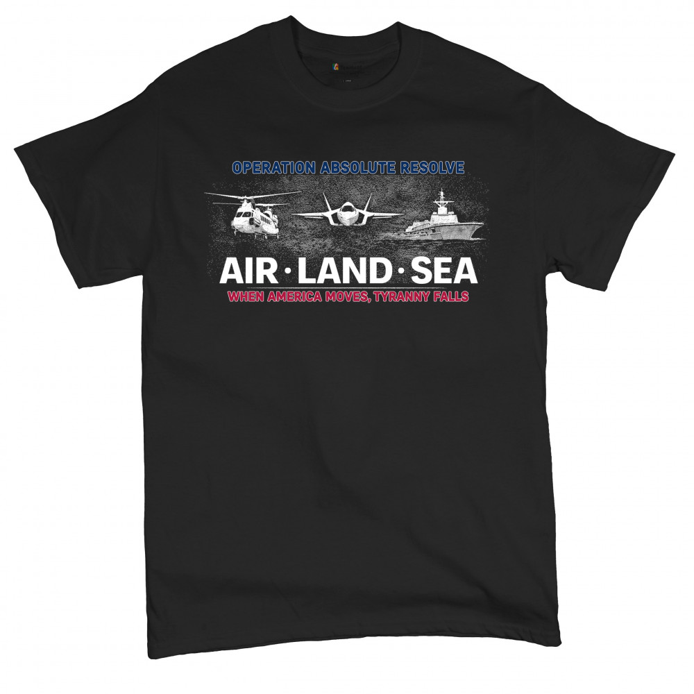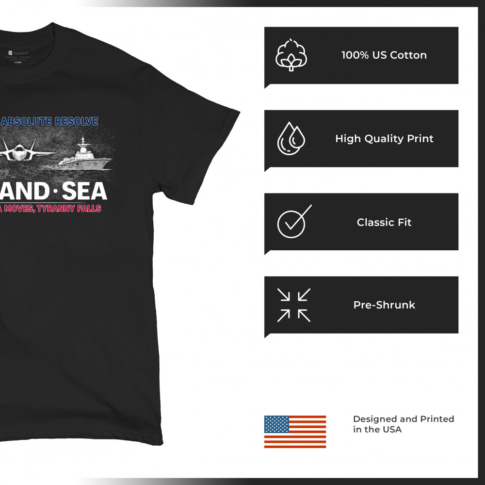 A striking patriotic graphic that combines air, land, and sea visuals to reflect coordination, resolve, and national strength. The design uses bold typography and classic military-inspired imagery without referencing specific people or conflicts. Created to feel powerful yet timeless, it works well for patriotic gatherings, heritage moments, and everyday wear.