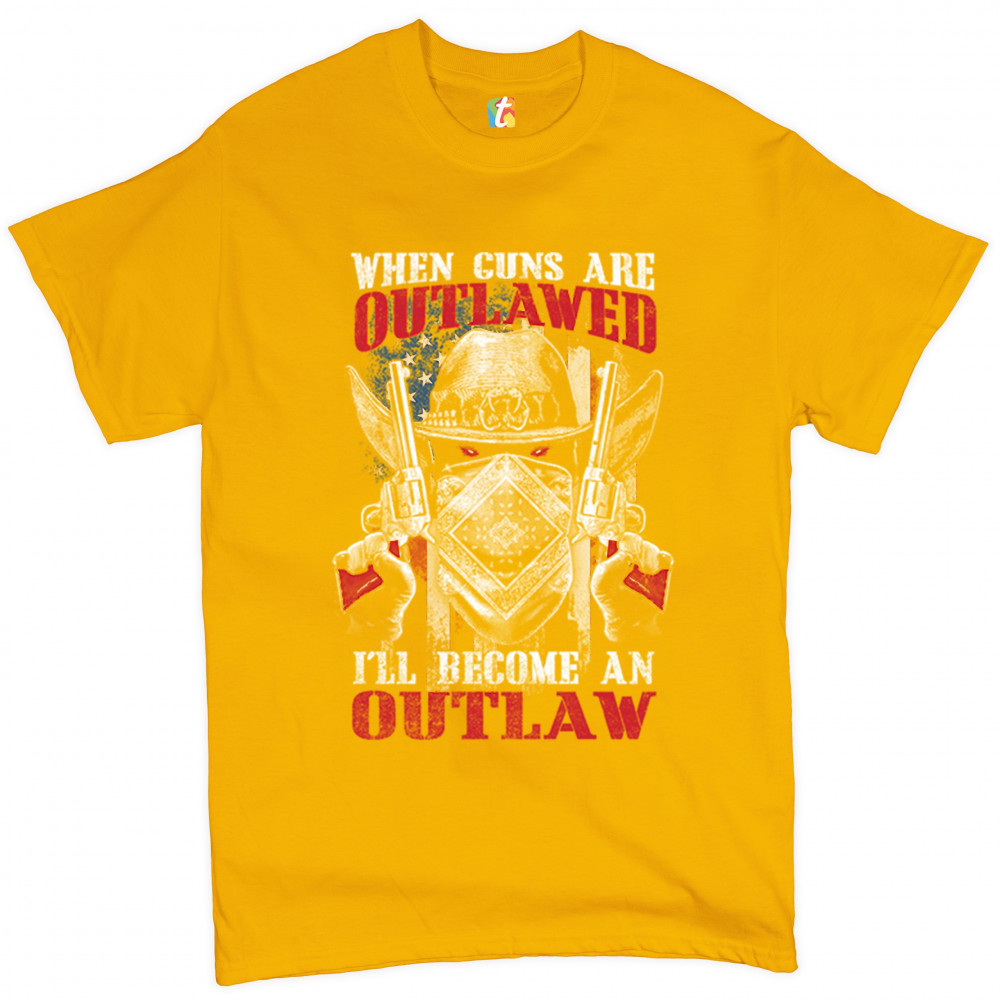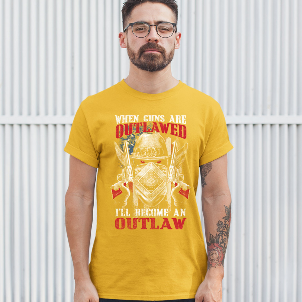 A print featuring a head wearing a cowboy hat and a bandana which covers most of the face, leaving only the red eyes to be seen. In each hand the person is holding a revoler and in the background there is the American flag. The print says: "When Guns Are