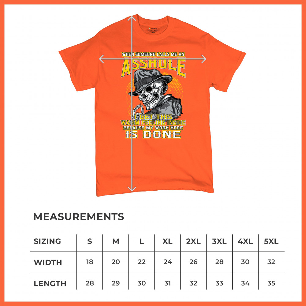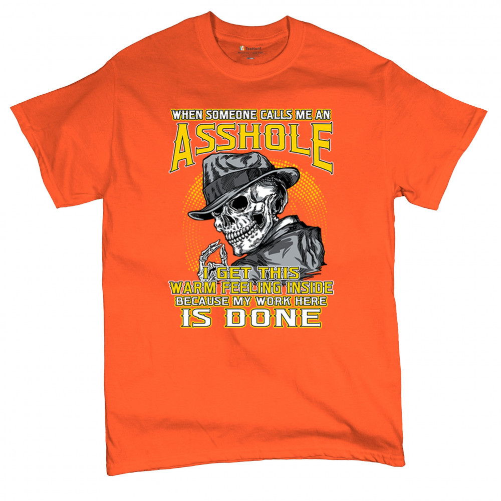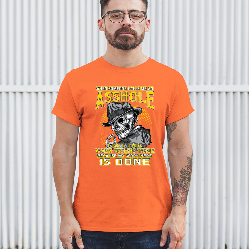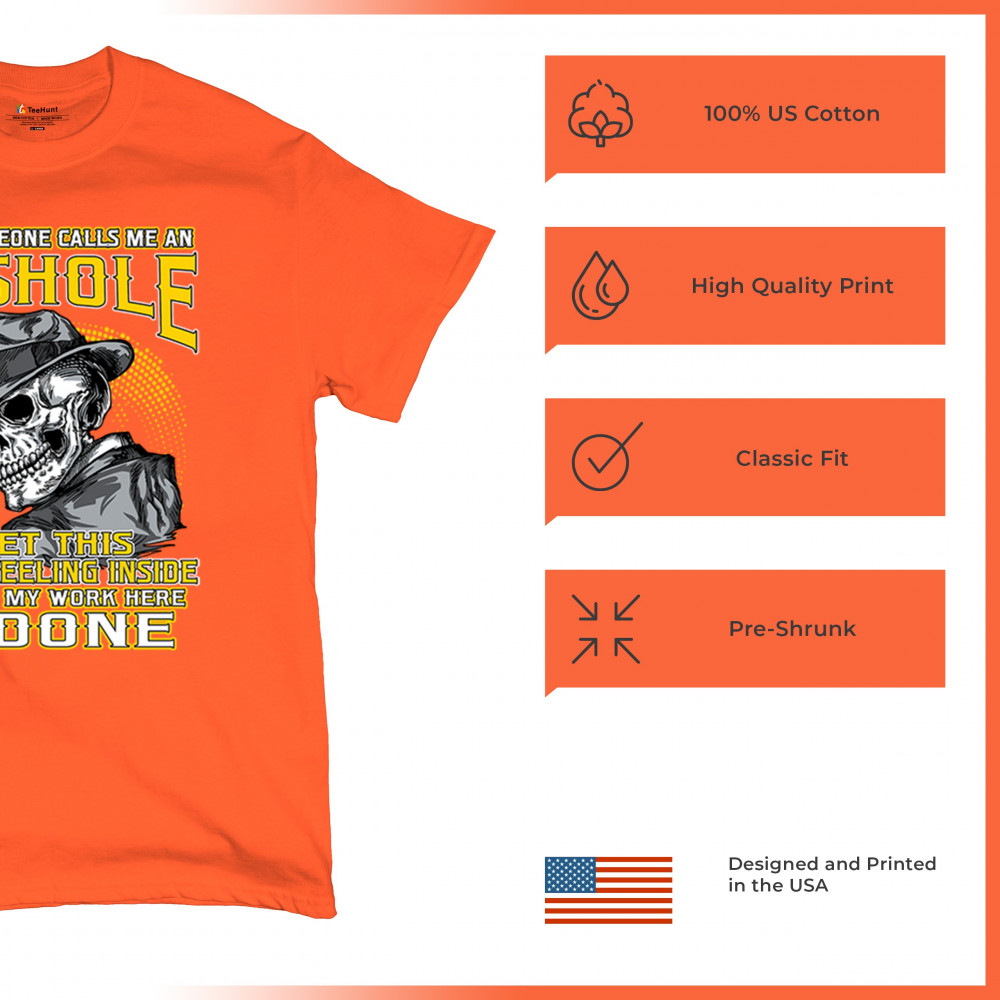 This badass design features a smirking skull in a fedora with a cigarette, backed by the line: “When someone calls me an asshole... my work here is done.†Built for dark humor fans, skull art lovers, and those who live life with sharp wit and zero regrets. Ideal for biker rallies, sarcasm nights, or anyone owning their attitude with pride.