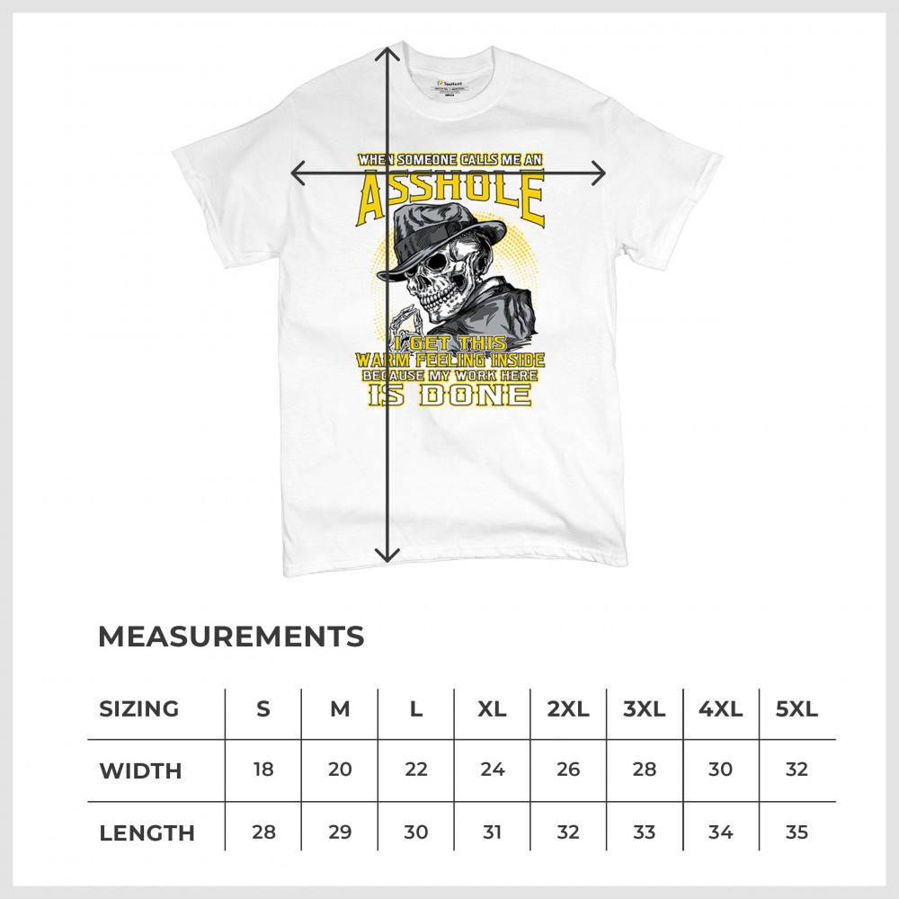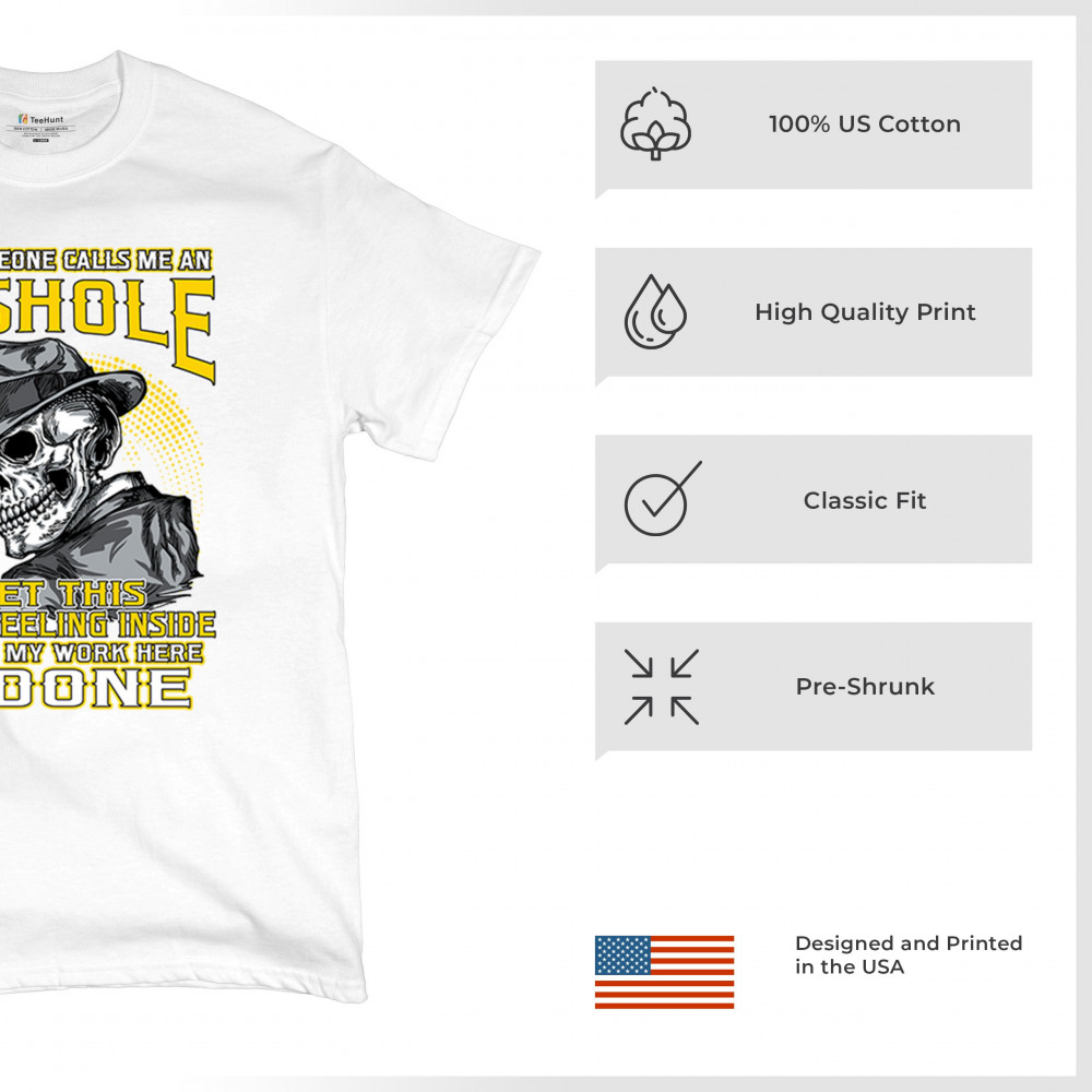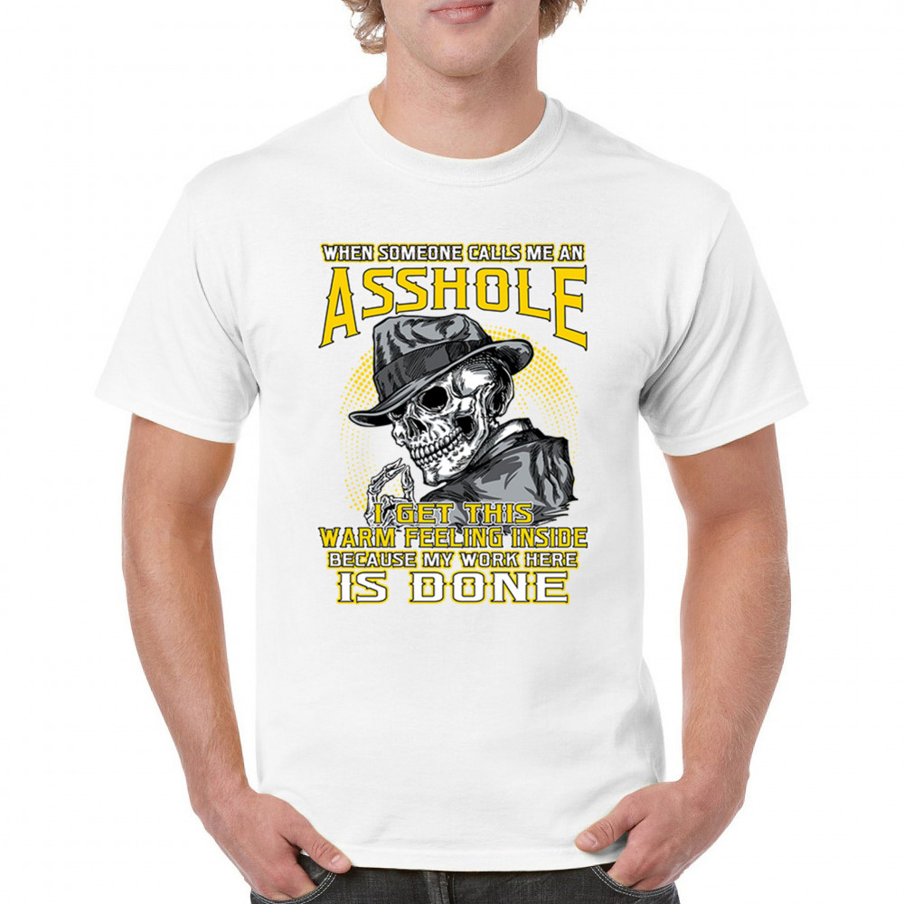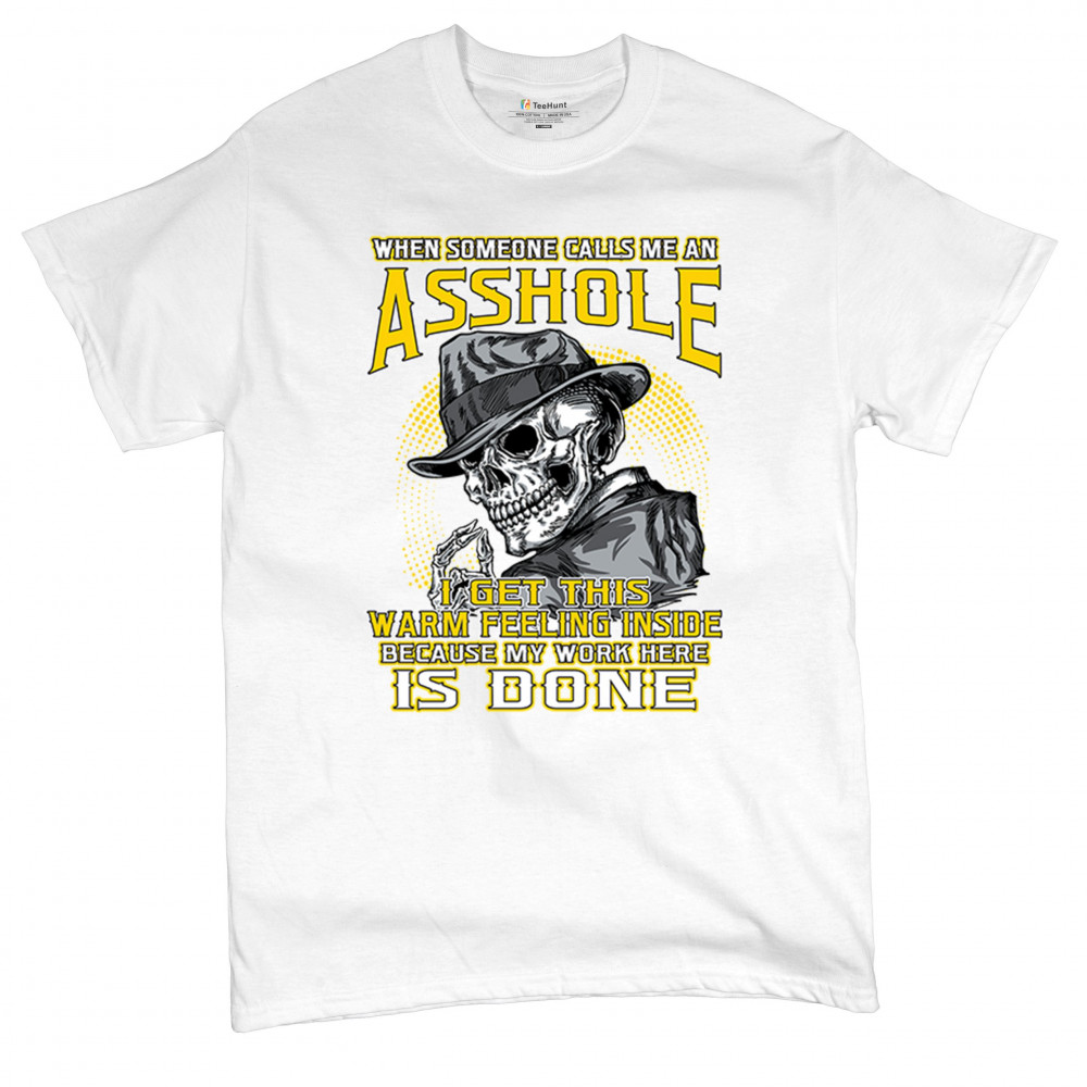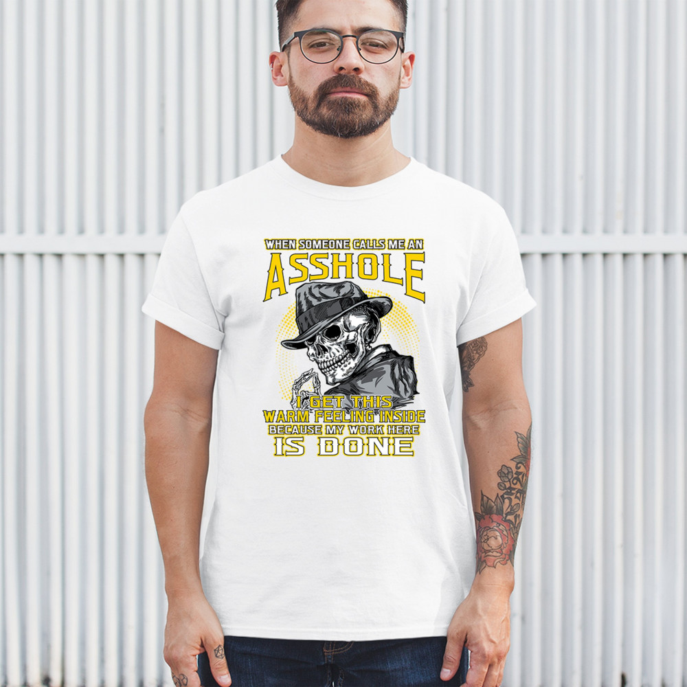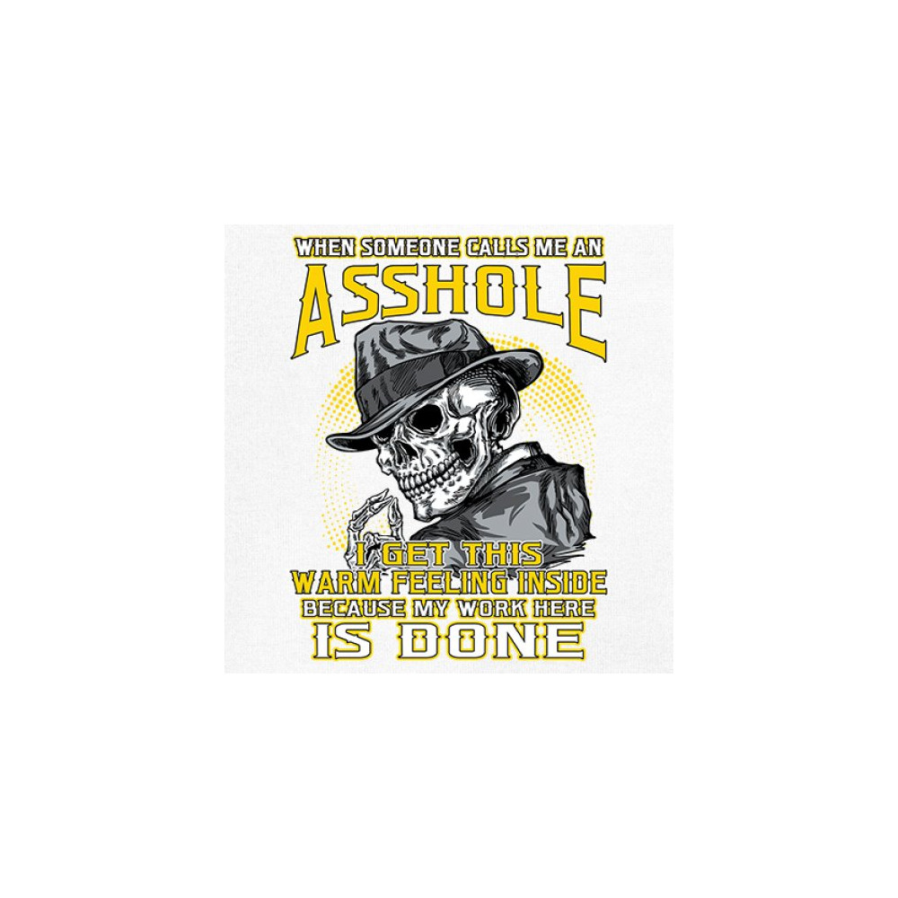 This badass design features a smirking skull in a fedora with a cigarette, backed by the line: “When someone calls me an asshole... my work here is done.†Built for dark humor fans, skull art lovers, and those who live life with sharp wit and zero regrets. Ideal for biker rallies, sarcasm nights, or anyone owning their attitude with pride.