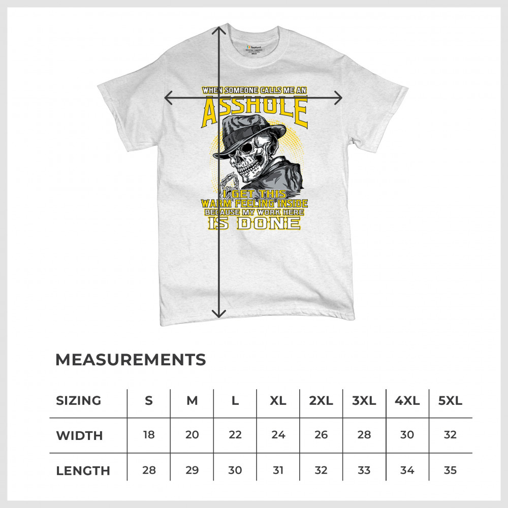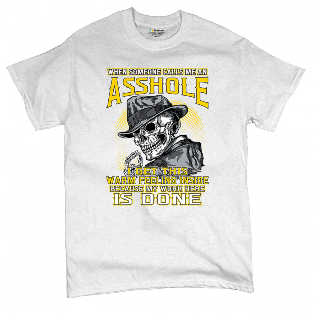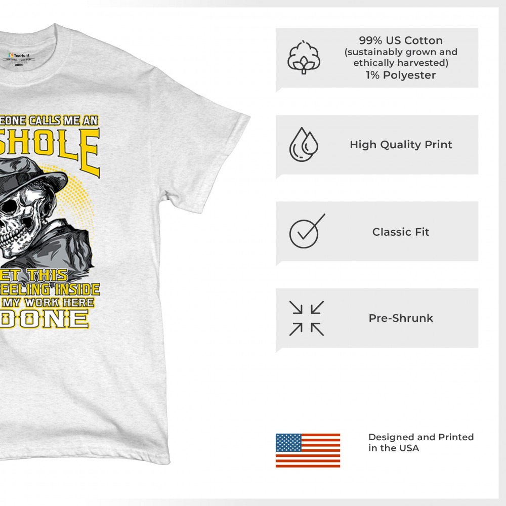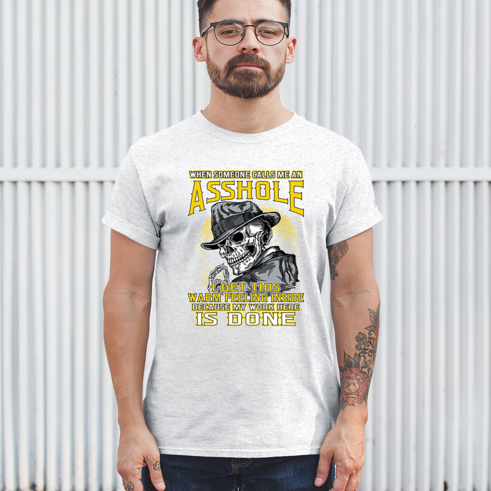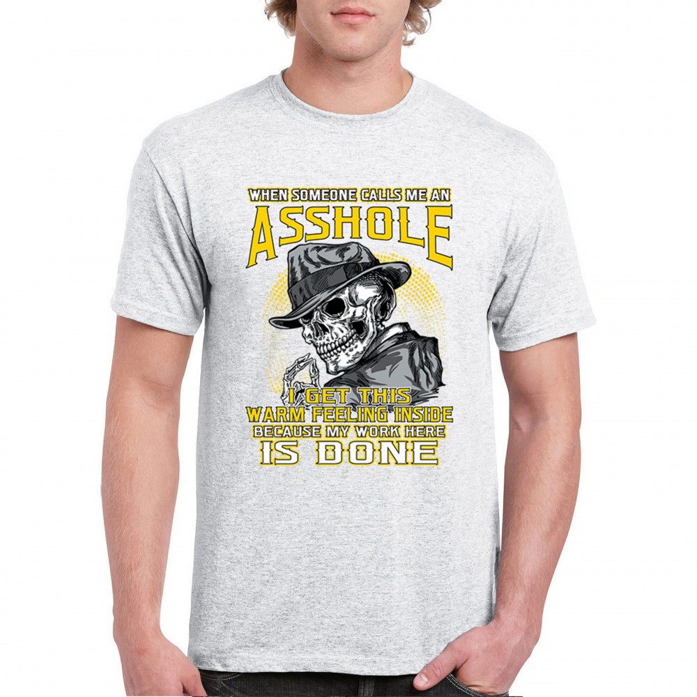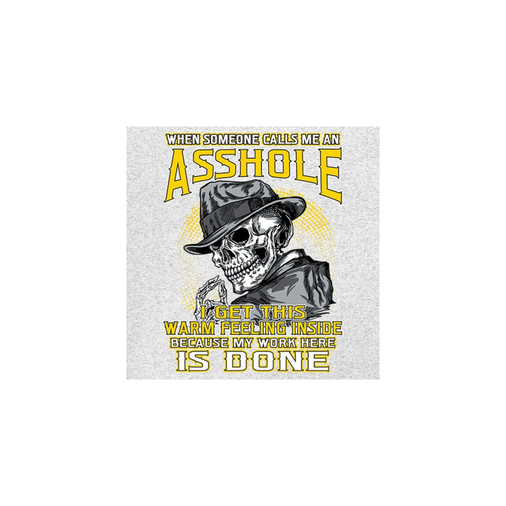 This badass design features a smirking skull in a fedora with a cigarette, backed by the line: “When someone calls me an asshole... my work here is done.†Built for dark humor fans, skull art lovers, and those who live life with sharp wit and zero regrets. Ideal for biker rallies, sarcasm nights, or anyone owning their attitude with pride.