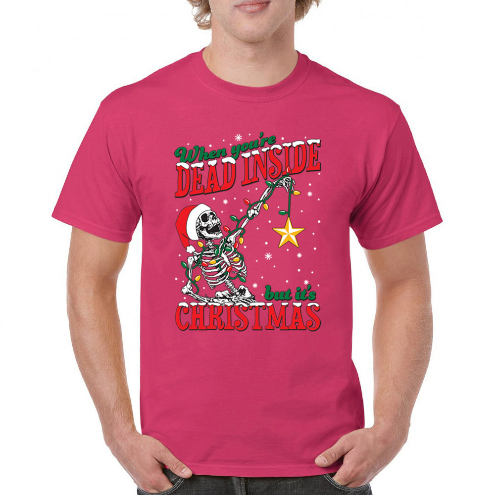 Bring humor and uniqueness to your holiday wardrobe with the "When You're Dead Inside But It's Christmas" design. This quirky creation features a skeleton embracing the festive spirit with colorful lights, a Santa hat, and a glowing star. Ideal for Secret Santa exchanges, ugly sweater parties, or anyone who loves blending a touch of humor with Christmas tradition. Celebrate the season in style with this unforgettable design.