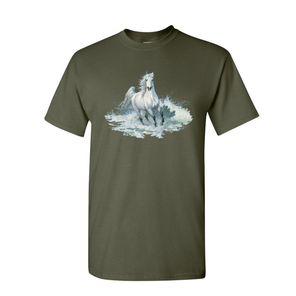 WHITE HORSE SPLASHING WATER t-shirt animal wild nature mustang mens tee shirt military green