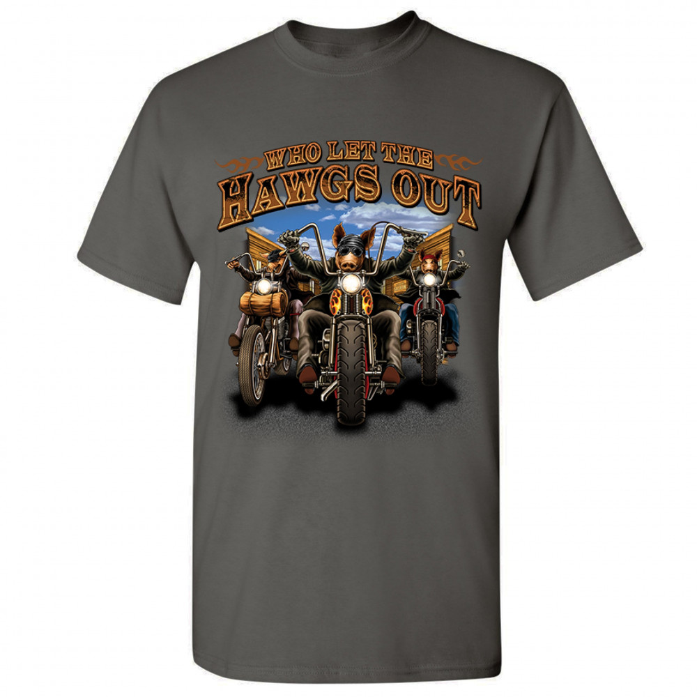 WHO LET THE HAWGS OUT t-shirt biker motorcycle gang live to ride men's tee charcoal