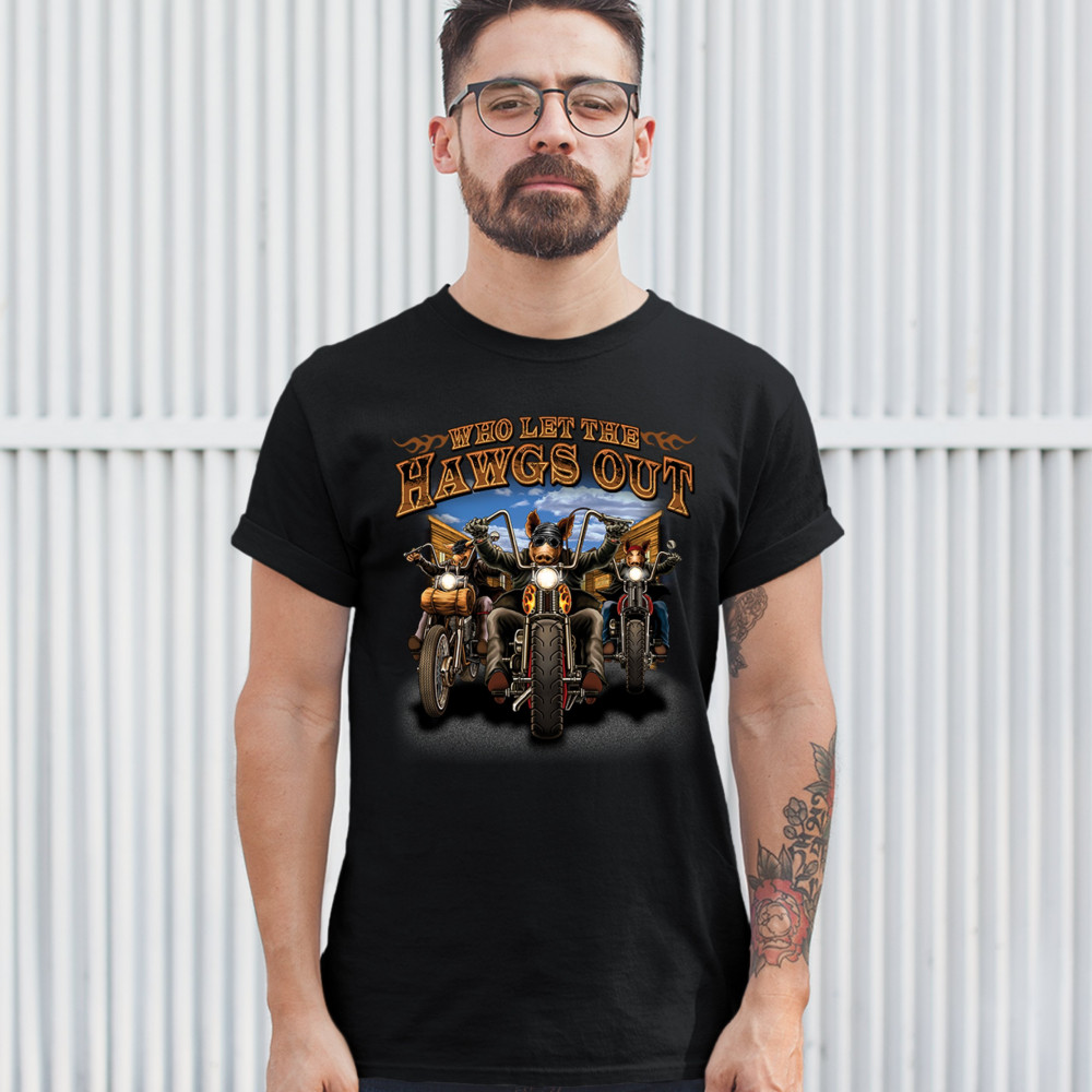 WHO LET THE HAWGS OUT t-shirt biker motorcycle gang live to ride men's tee black