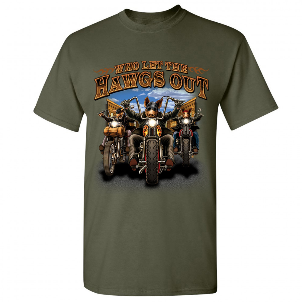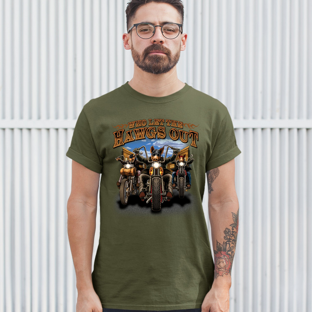 WHO LET THE HAWGS OUT t-shirt biker motorcycle gang live to ride men's tee military green