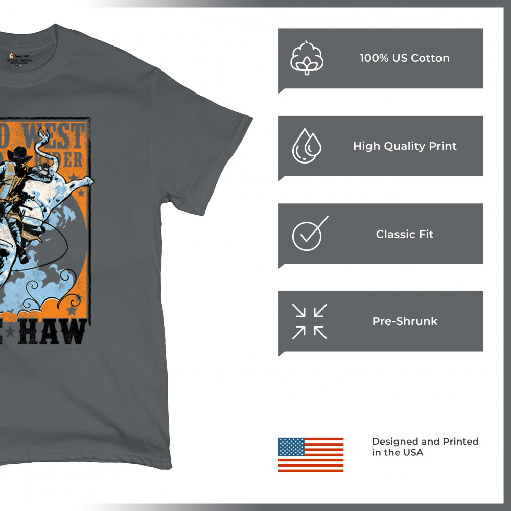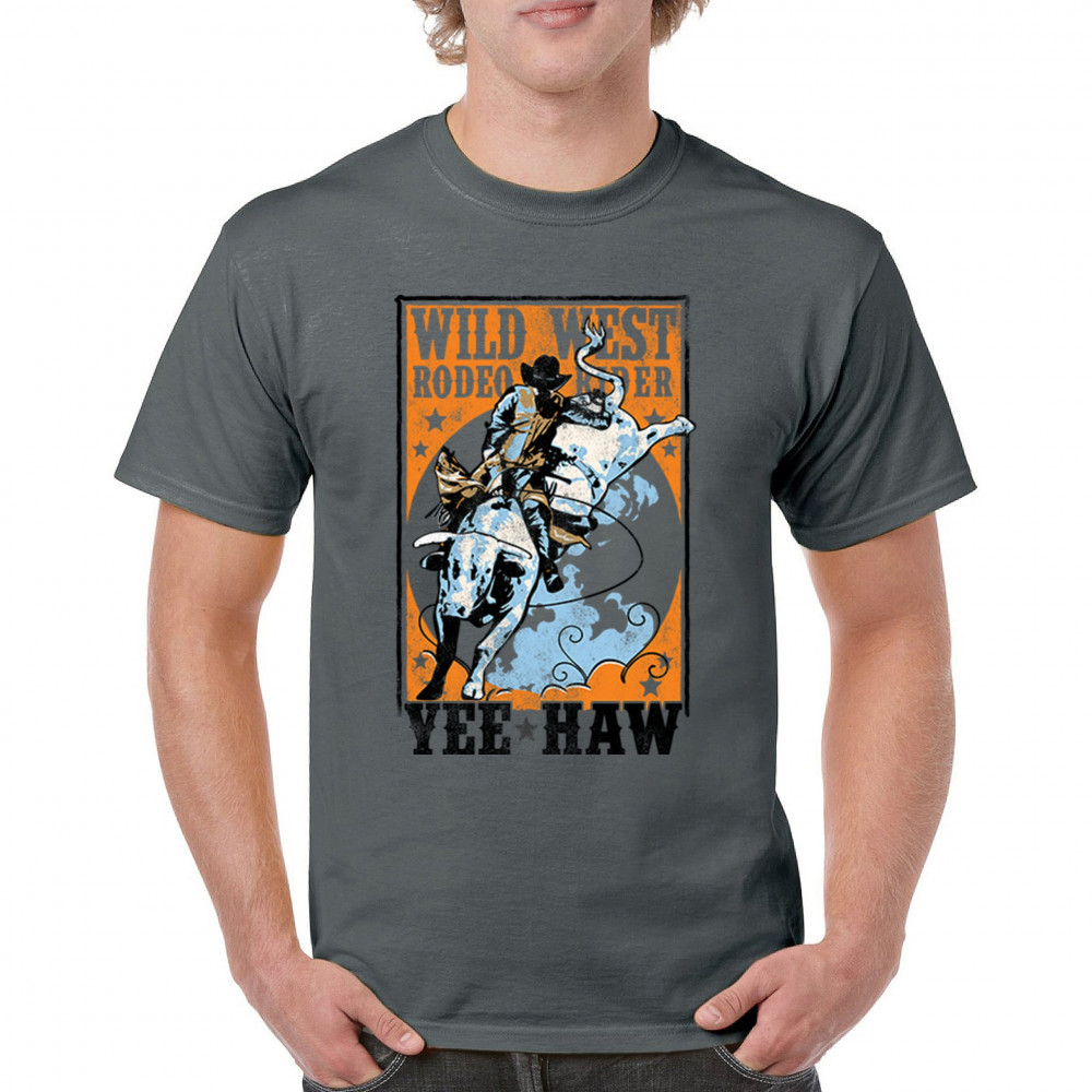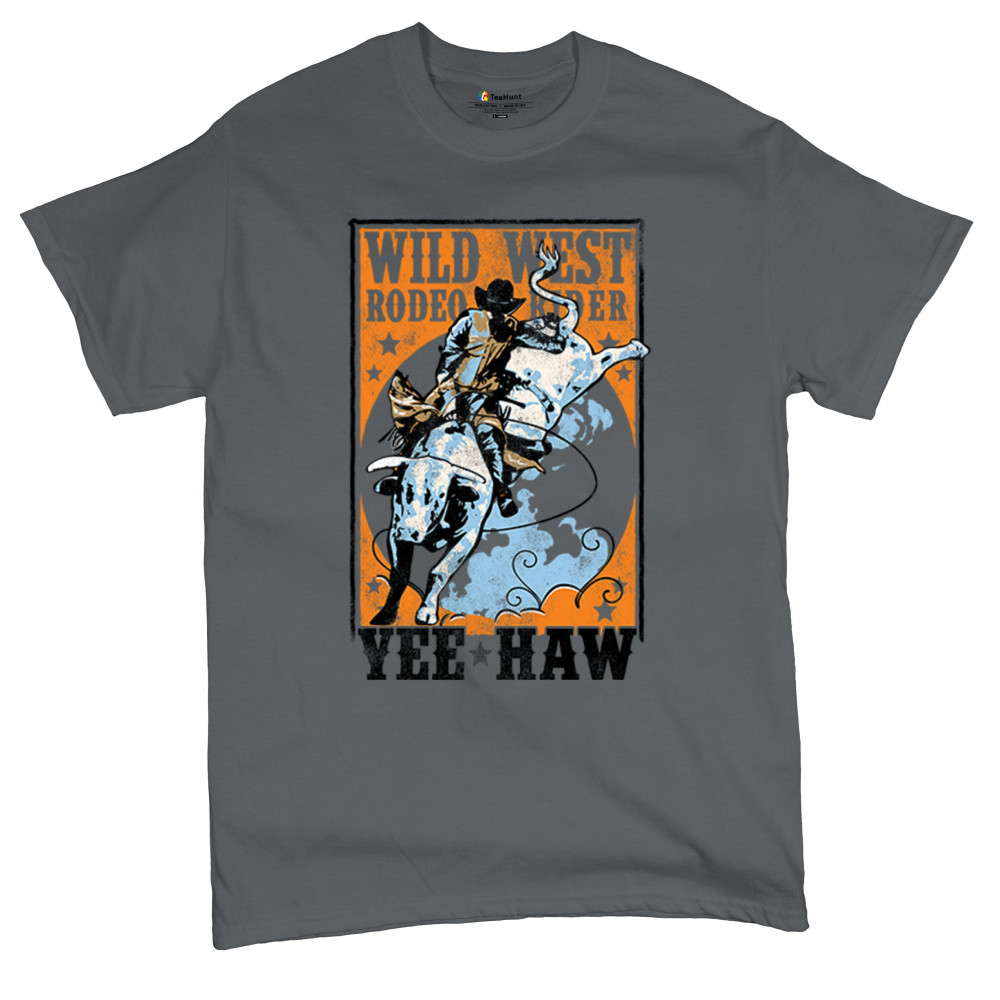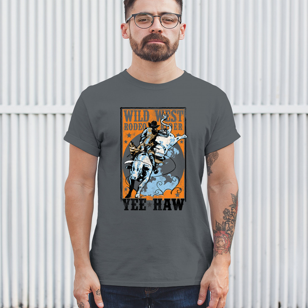 Bold cowboy bull riding design with orange backdrop, perfect for rodeo fans, western events, and country festivals.