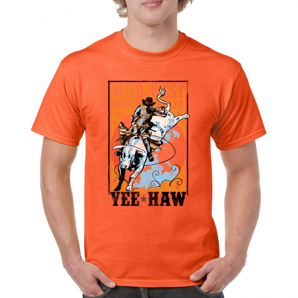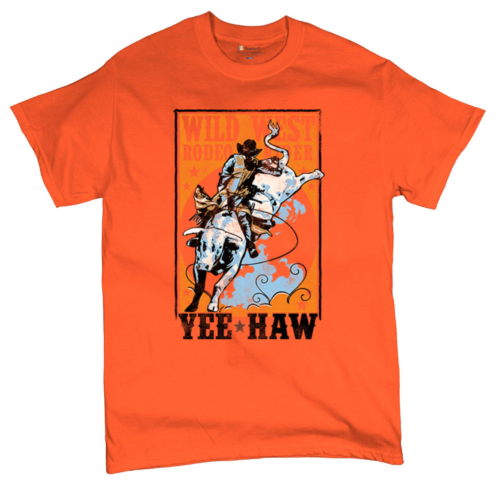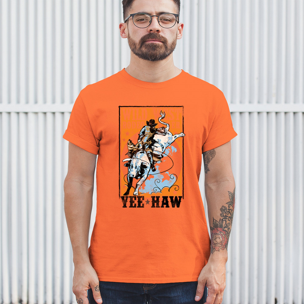 Bold cowboy bull riding design with orange backdrop, perfect for rodeo fans, western events, and country festivals.