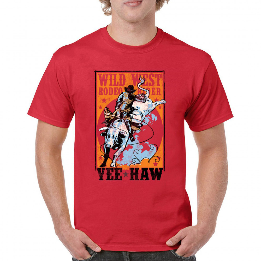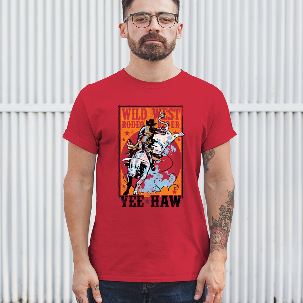 Bold cowboy bull riding design with orange backdrop, perfect for rodeo fans, western events, and country festivals.