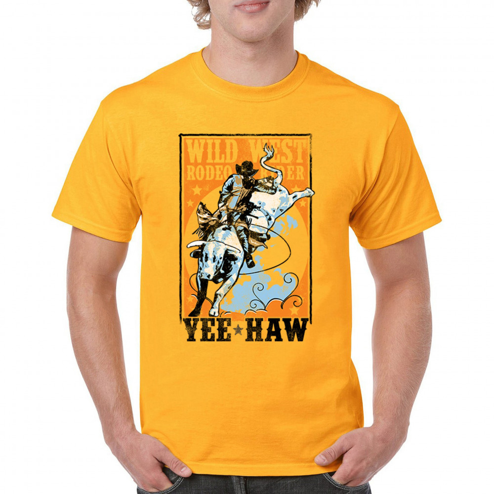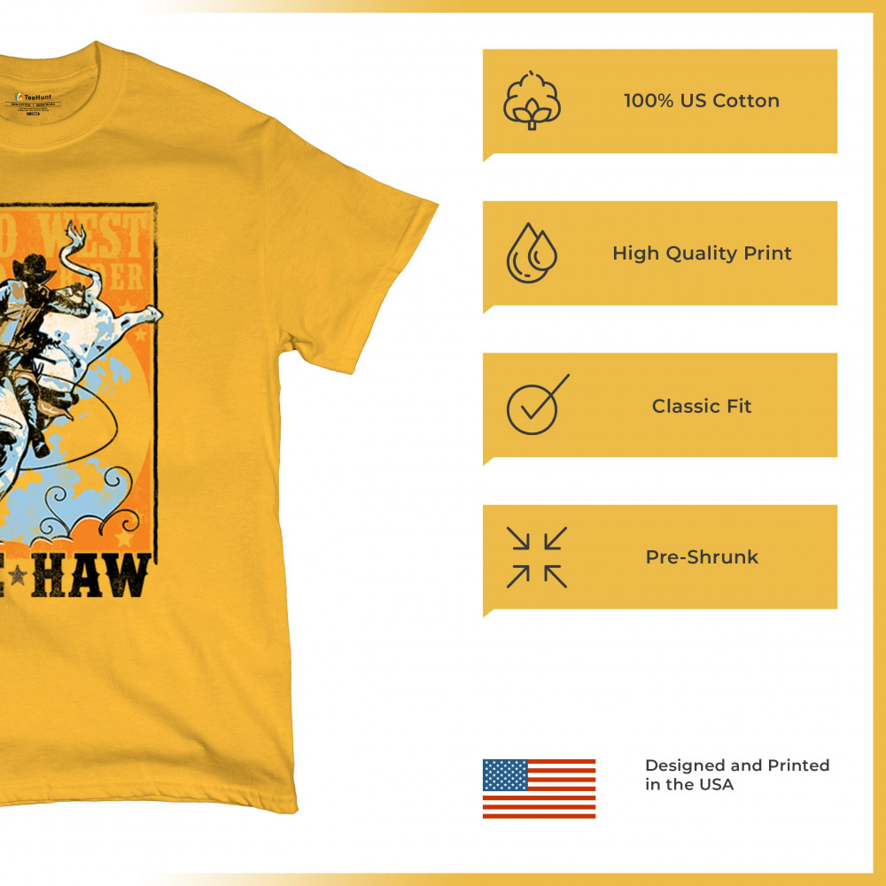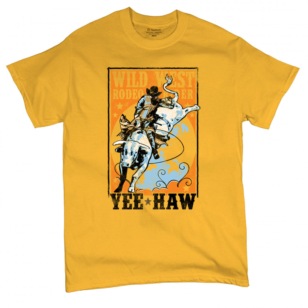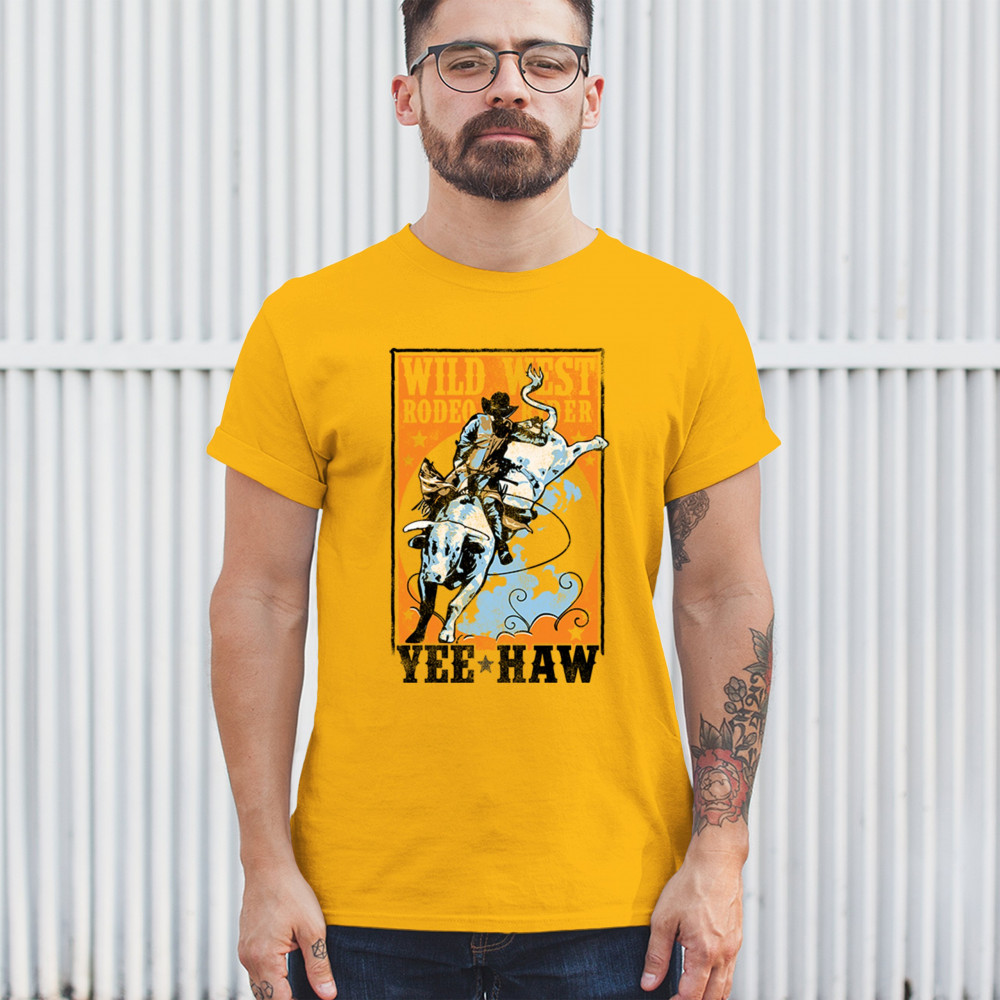 Bold cowboy bull riding design with orange backdrop, perfect for rodeo fans, western events, and country festivals.