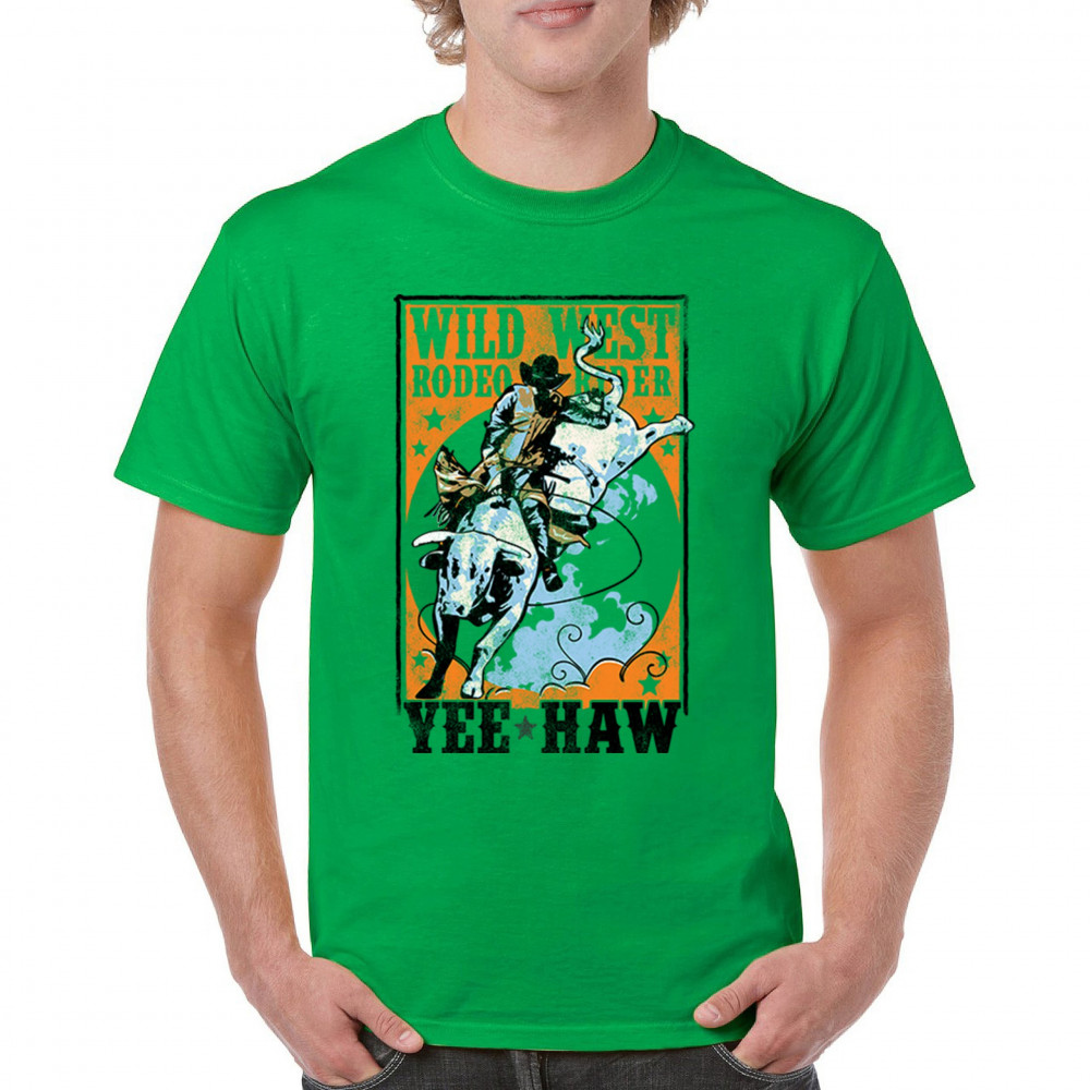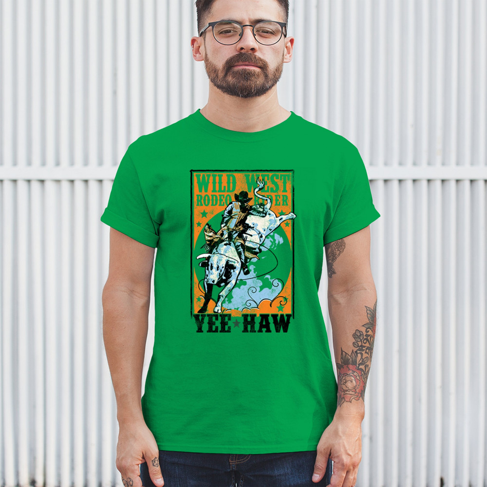 Bold cowboy bull riding design with orange backdrop, perfect for rodeo fans, western events, and country festivals.