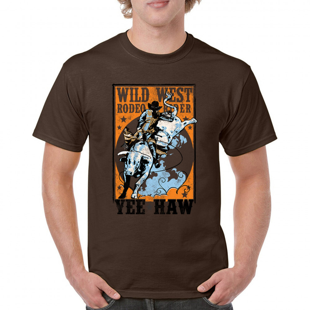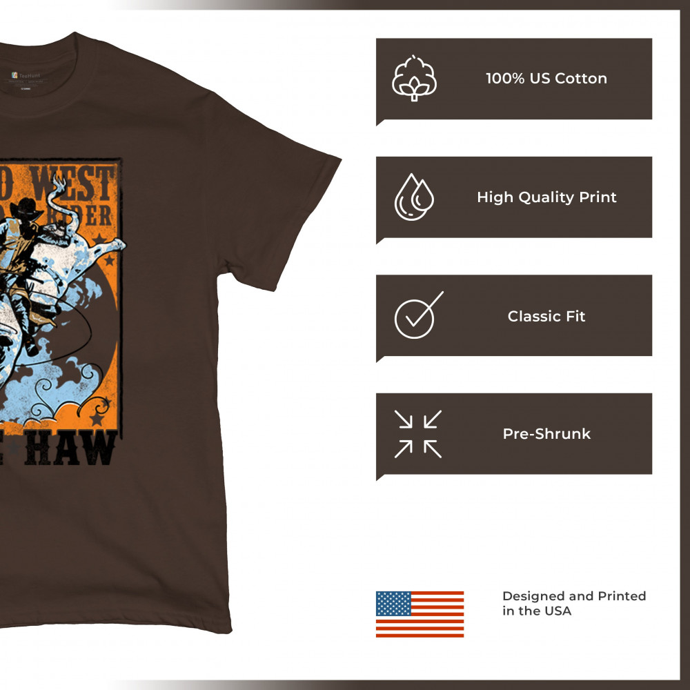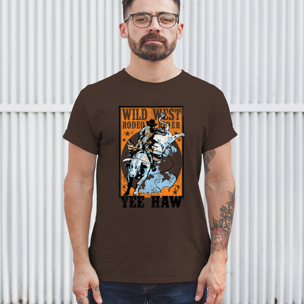 Bold cowboy bull riding design with orange backdrop, perfect for rodeo fans, western events, and country festivals.