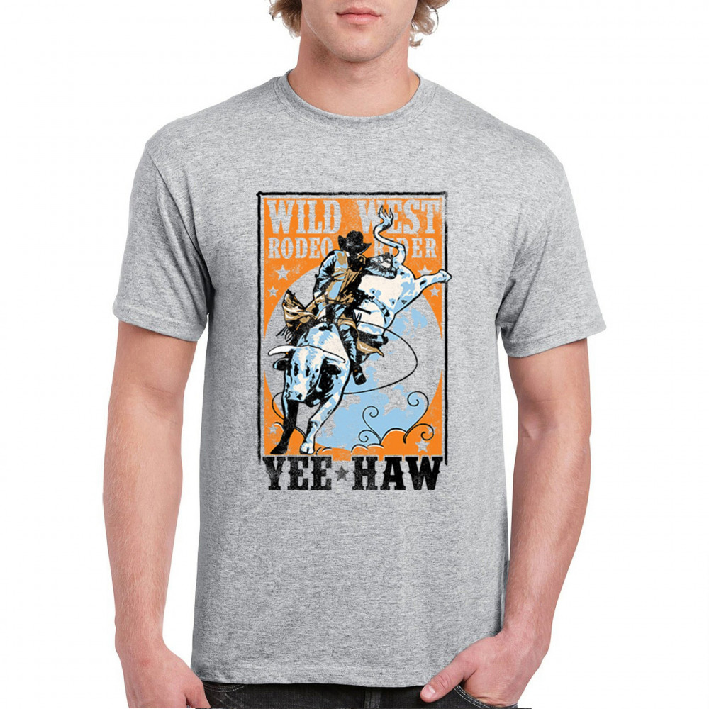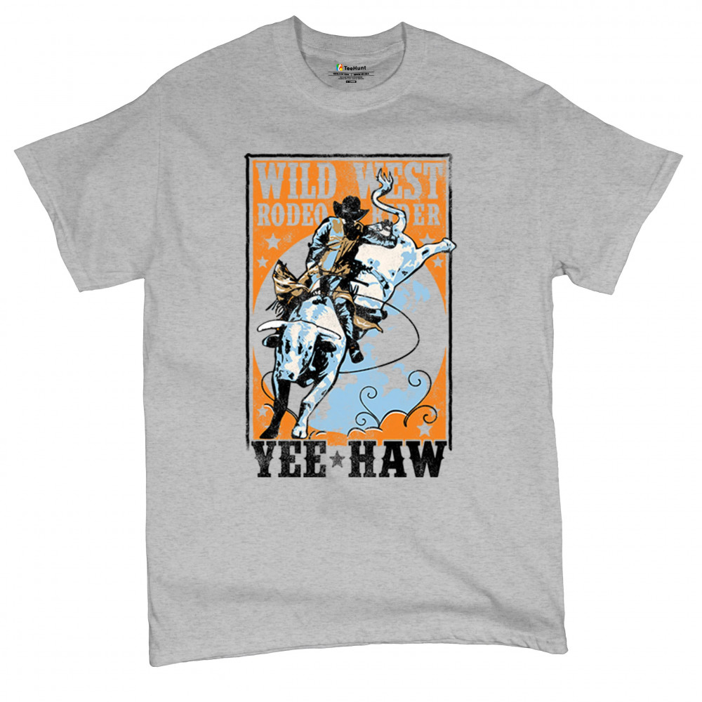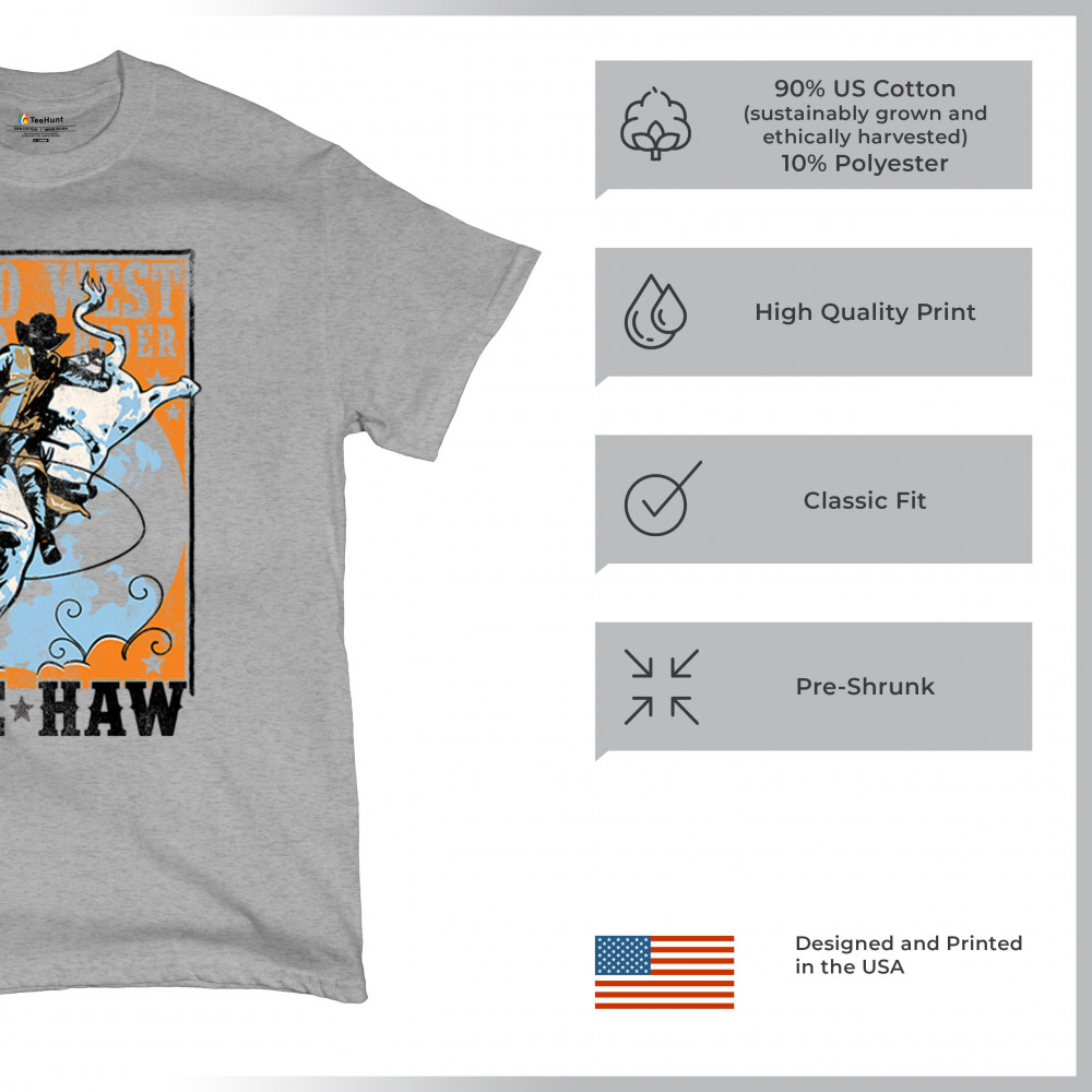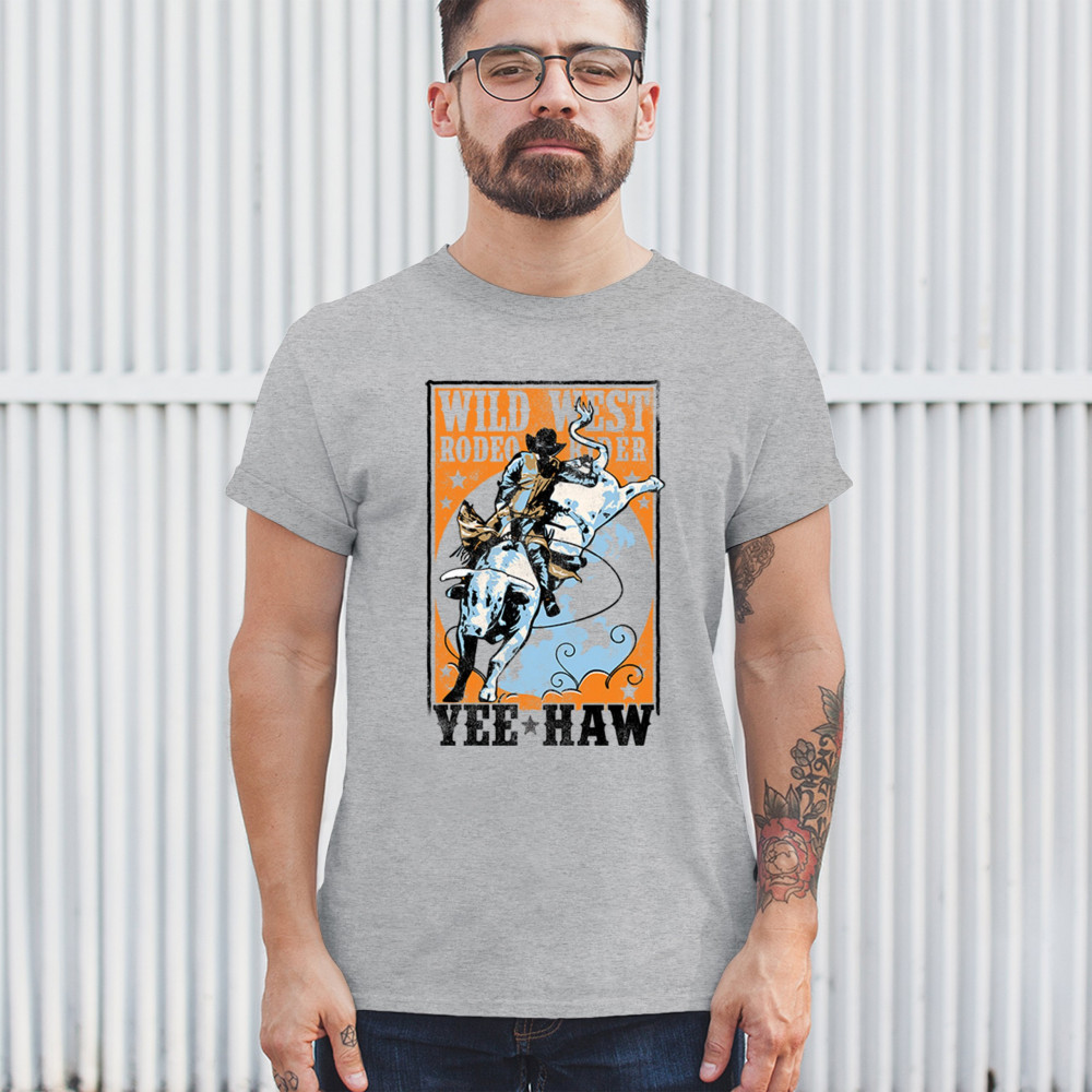 Bold cowboy bull riding design with orange backdrop, perfect for rodeo fans, western events, and country festivals.